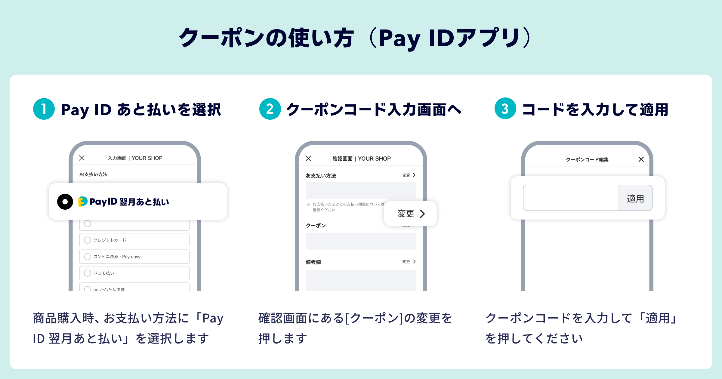 もしくは「Pay ID 3回あと払い」を選択してお買いものしてください。クーポンコードの入力