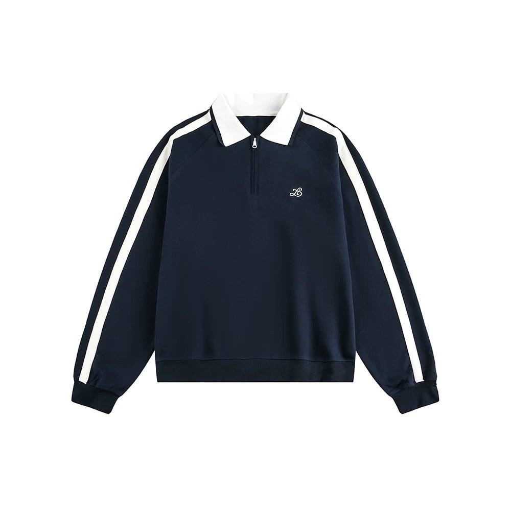 両袖に走るラインがアクセントになった、ハーフジップ仕様のポロスウェット。