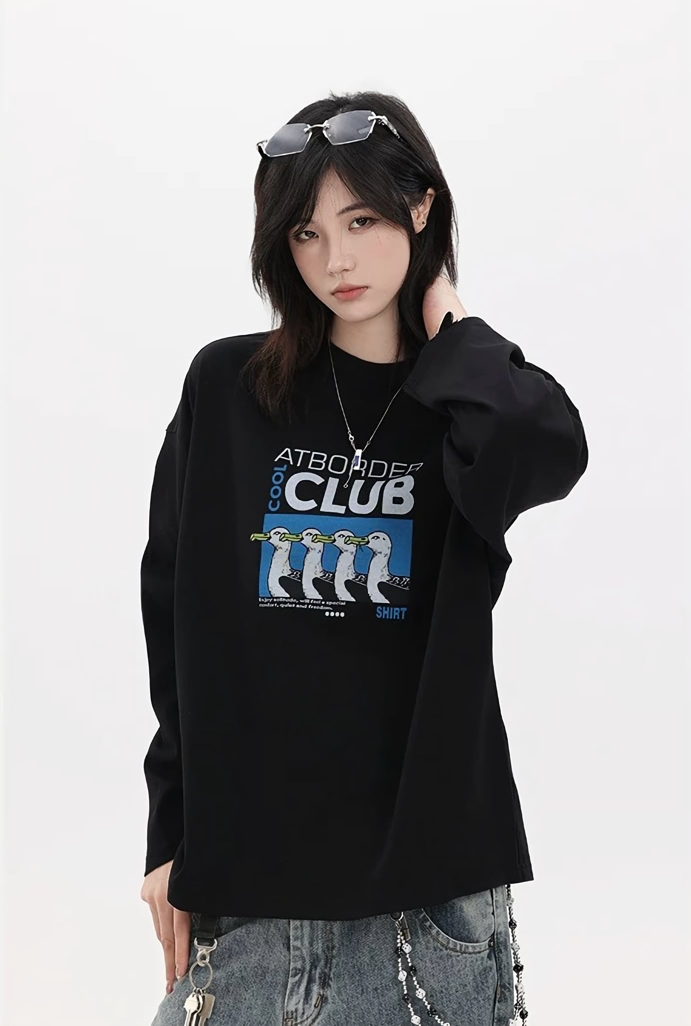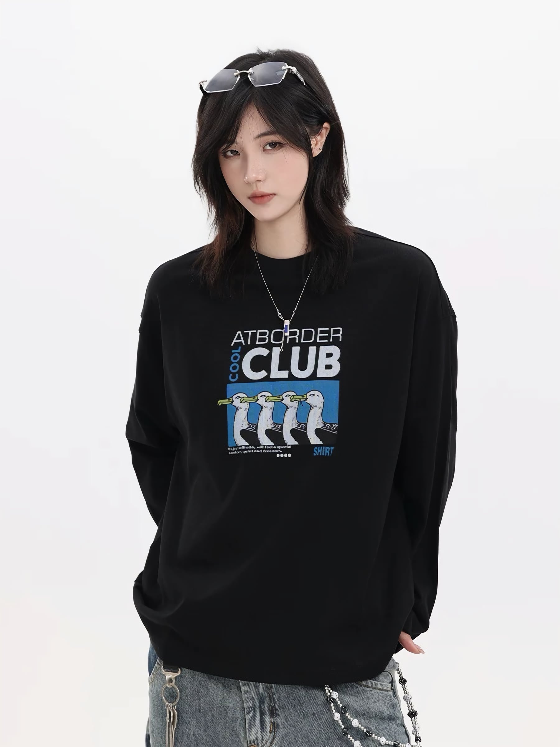 フロントには「ATBORDER CLUB」のタイポグラフィとユニークなカモメのデザインを大胆に配置。遊び心のあるグラフィックがコーディネートのアクセントになります◎