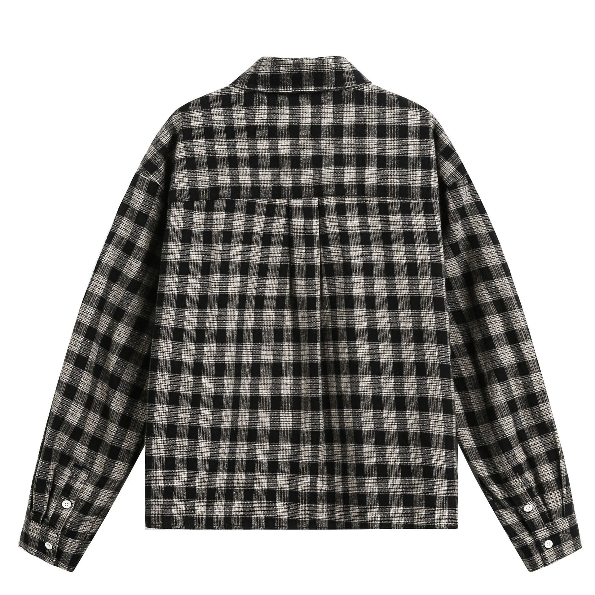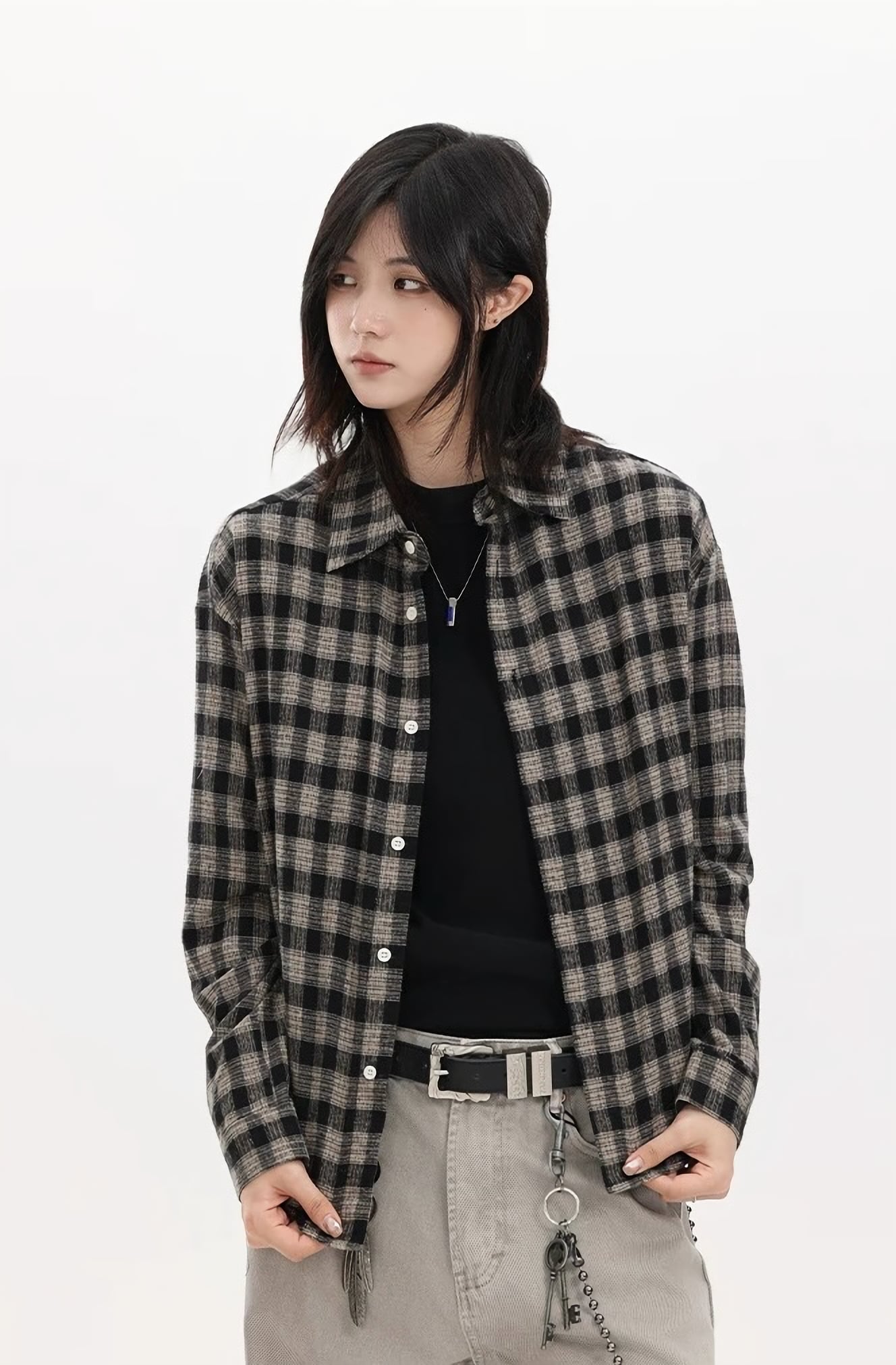 “シティムード漂うチェックシャツ、季節を問わず活躍する一枚。”