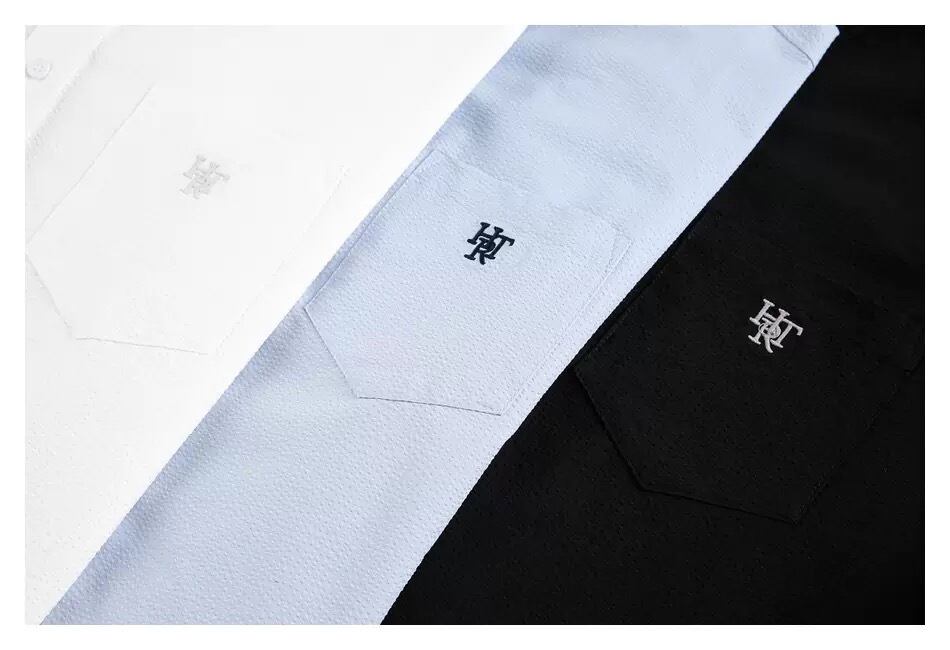 胸元の小さなロゴ刺繍が、シンプルなシャツにさりげないアクセントをプラス。