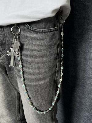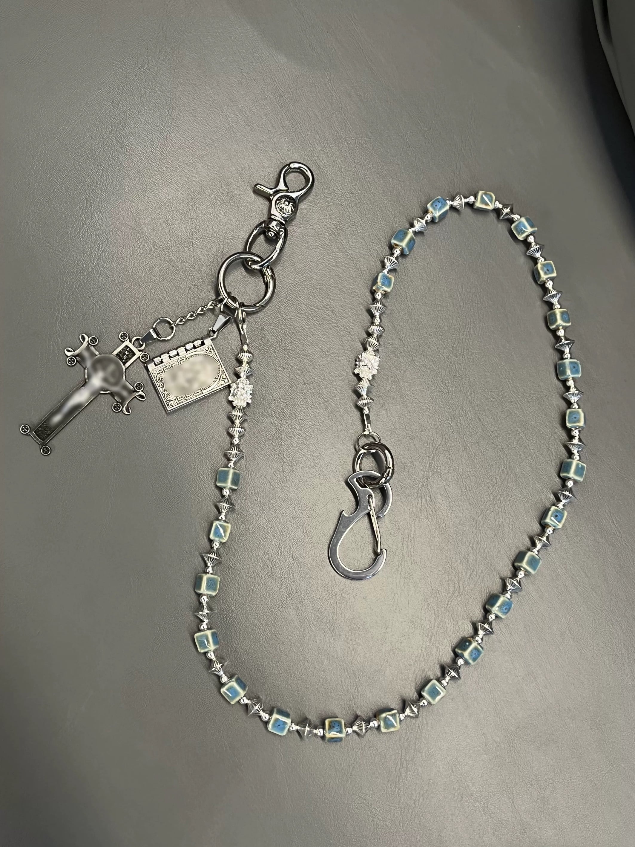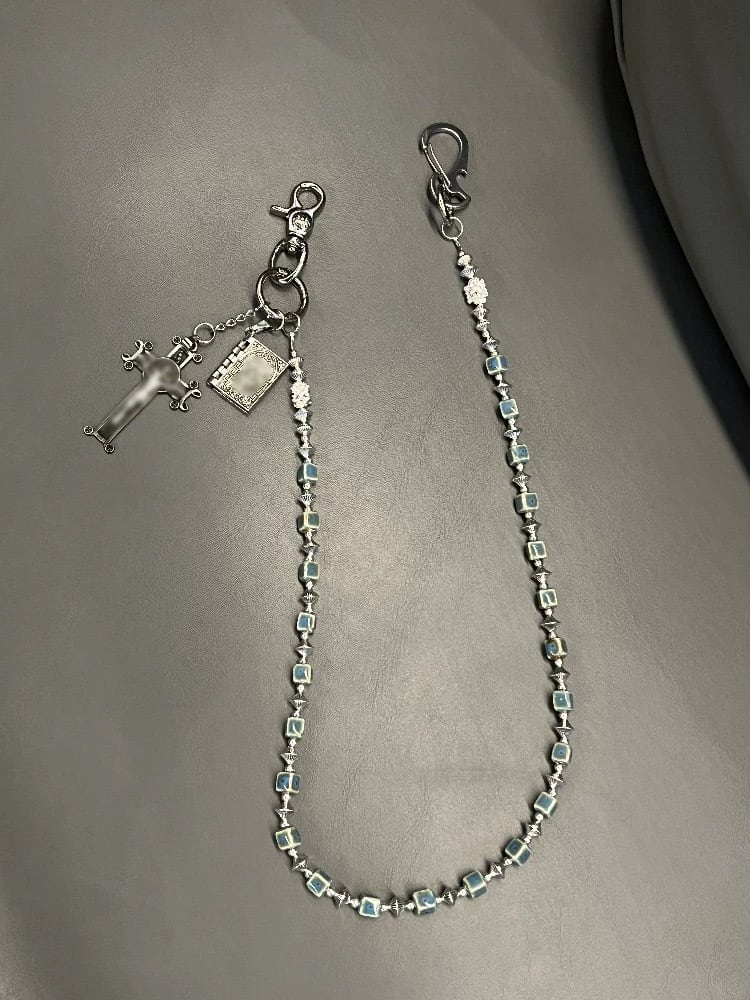 スクエアビーズが放つ独特の光沢と、クロスモチーフのチャームが印象的なウォレットチェーン。
