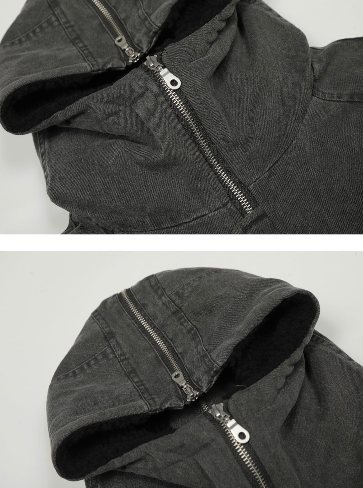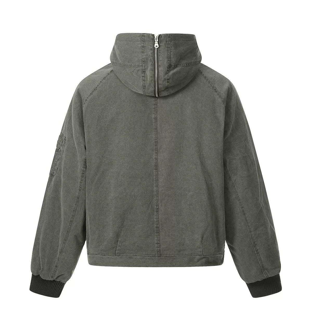 首元まで覆うハイネック仕様と大ぶりのフラップポケットが存在感を放ち、袖のユーティリティポケットやドローコードで実用性も確保。