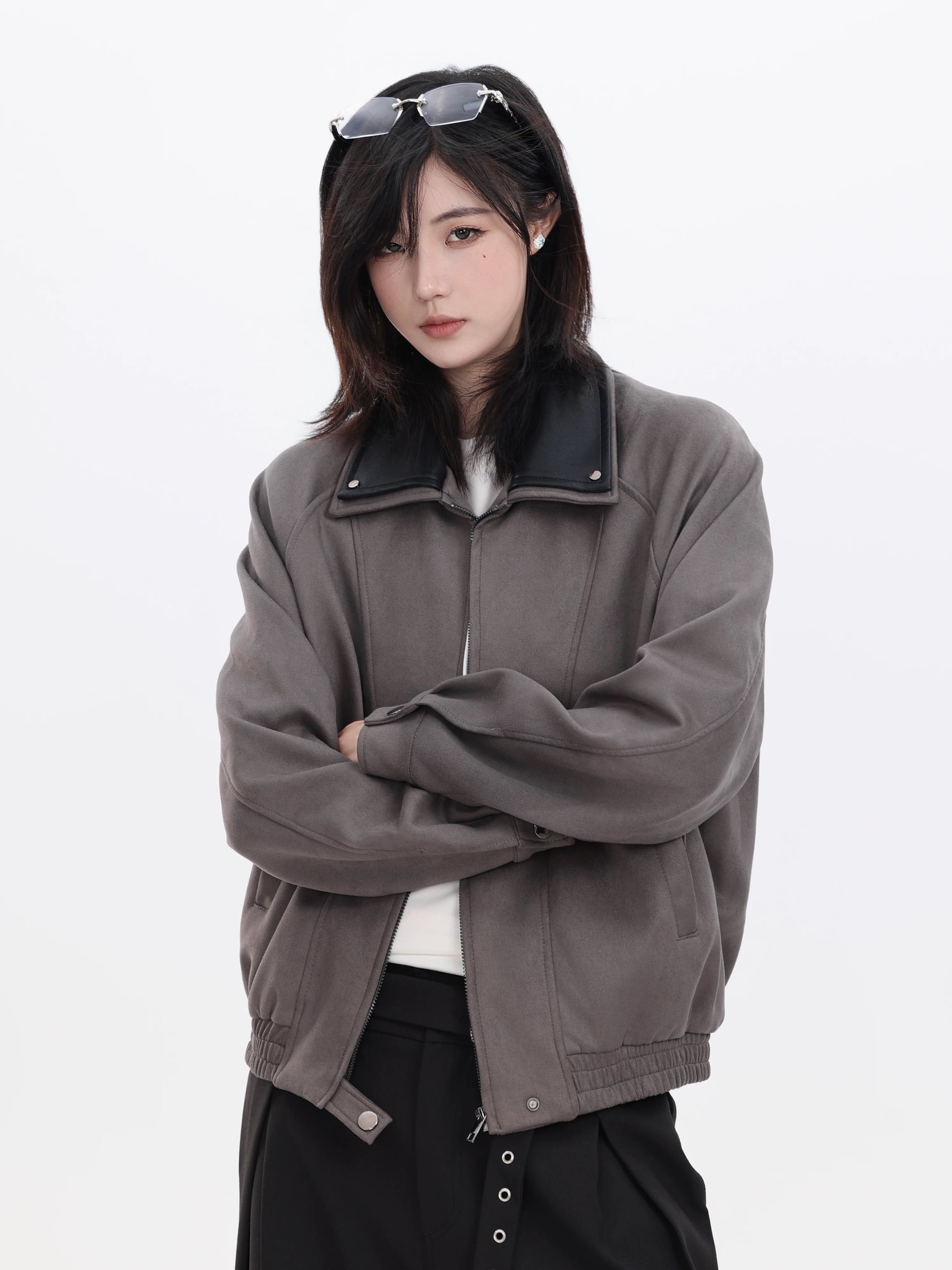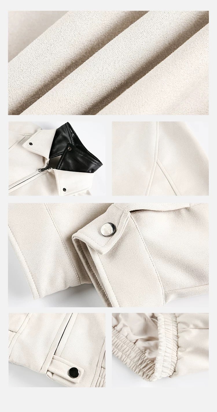 柔らかなスエード生地に、フェイクレザーの切り替え襟を組み合わせたジップアップジャケット。