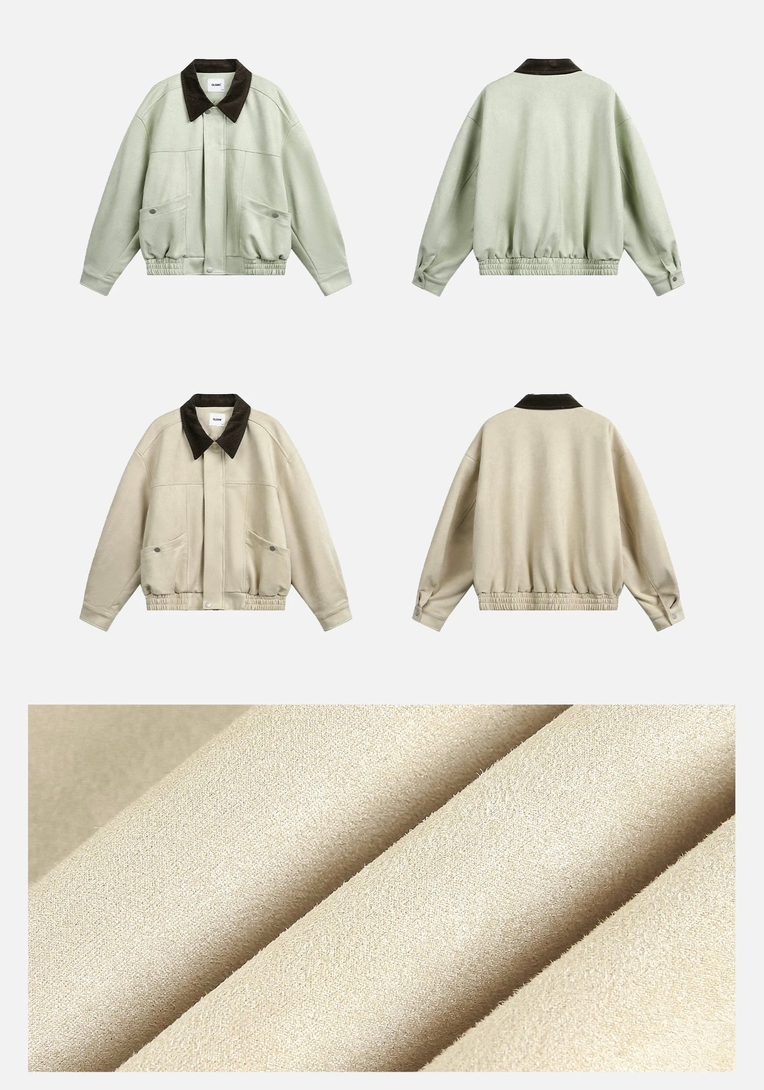 スエードタッチの柔らかな生地に、コーデュロイ素材の襟を組み合わせたショートジャケット。