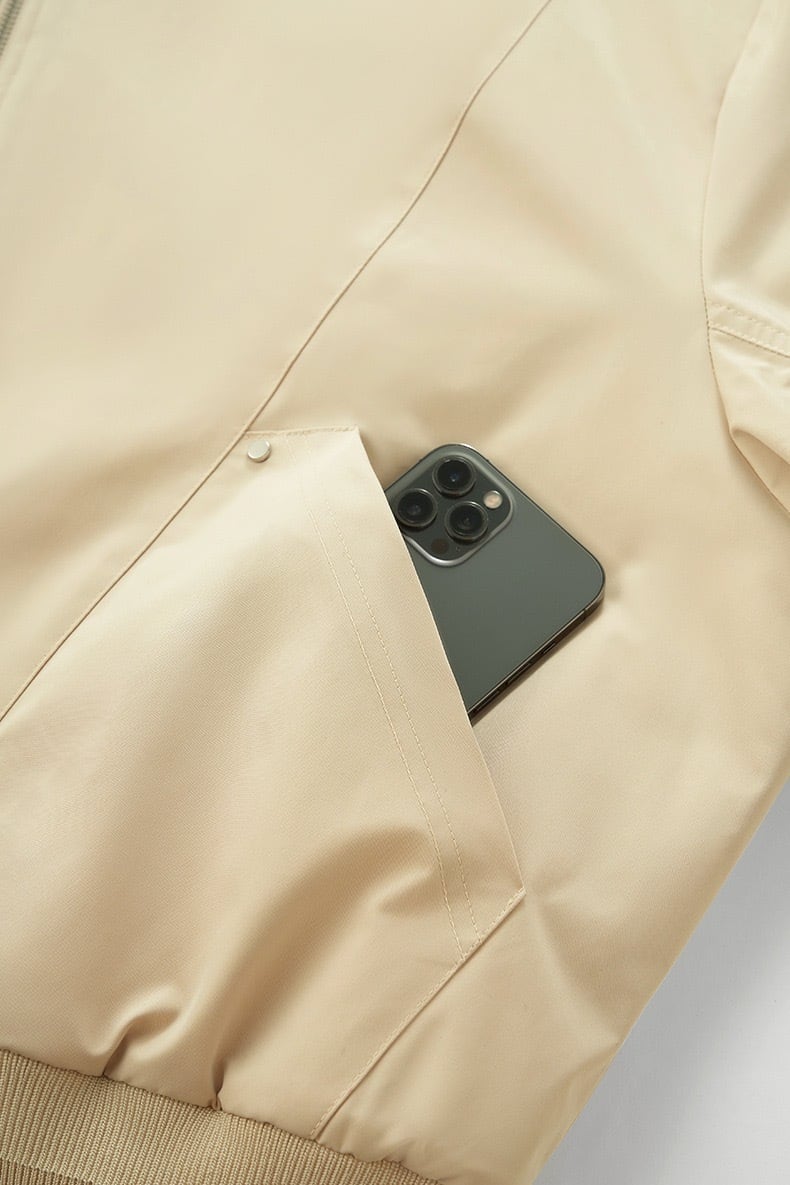 軽やかなシェルの内側には、バーガンディのキルティングライナーを隠し、開いた瞬間にだけ覗くコントラストが静かに印象を残します。