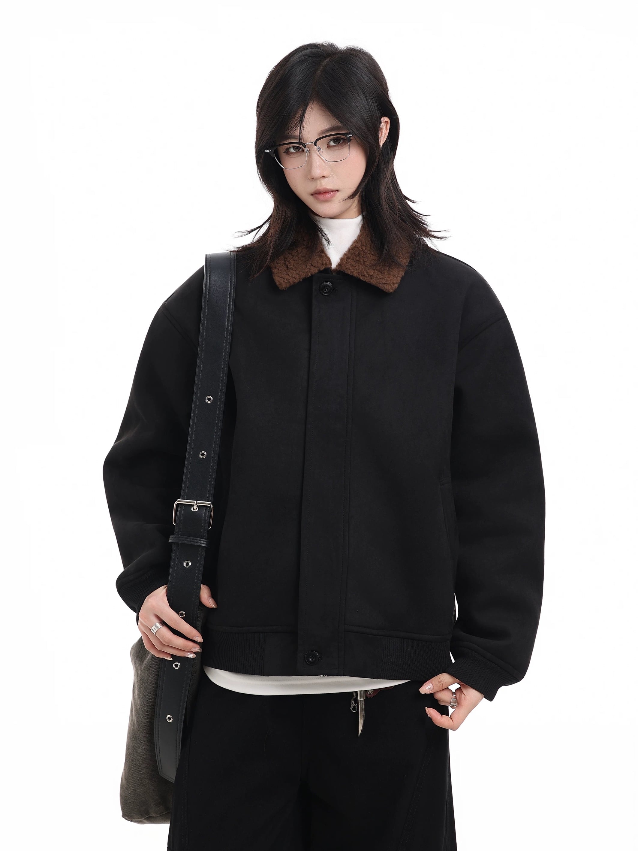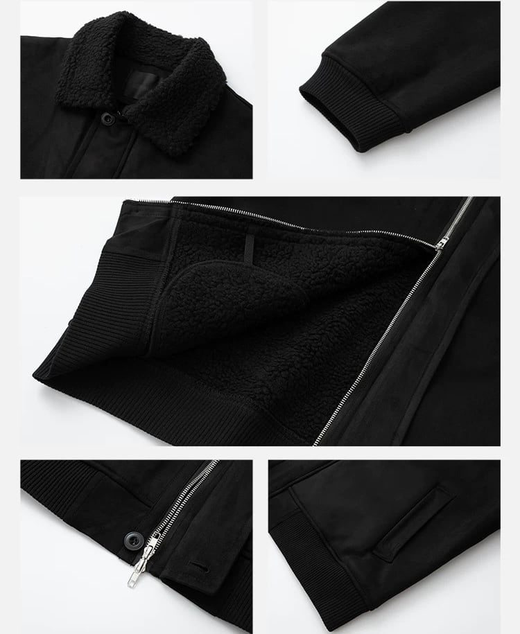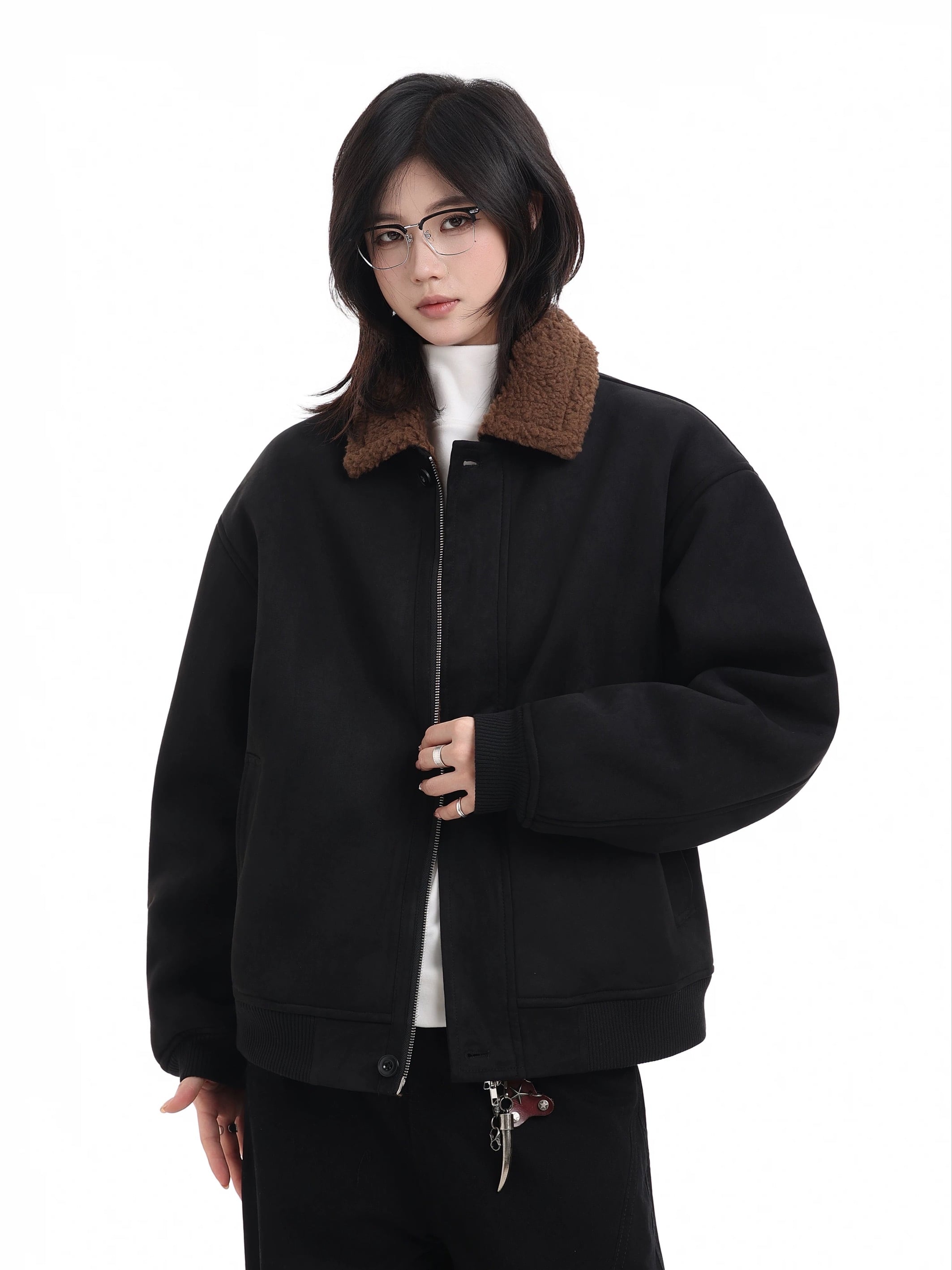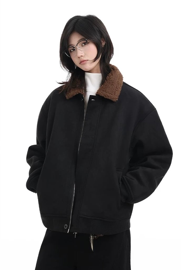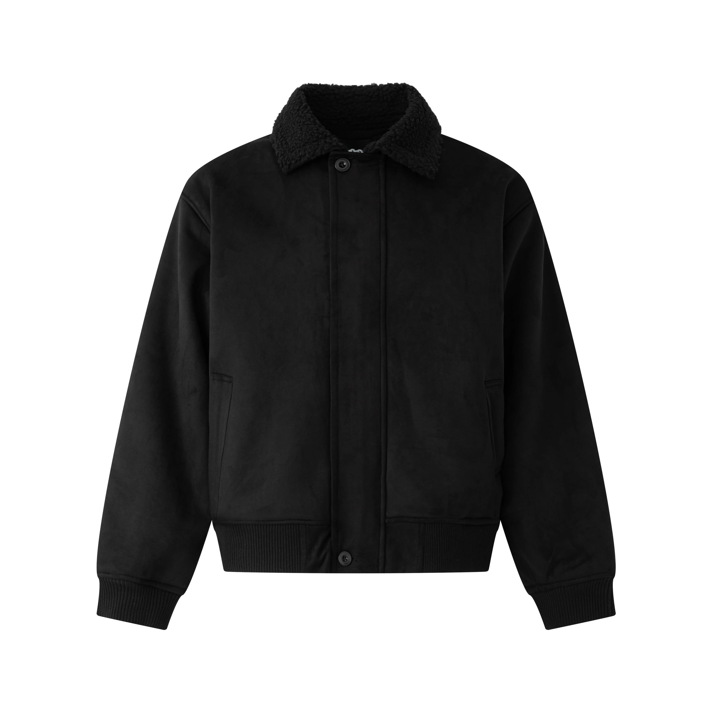 表面はマットなスエード調、内側には柔らかいフリースを仕込んだボリュームジャケット。