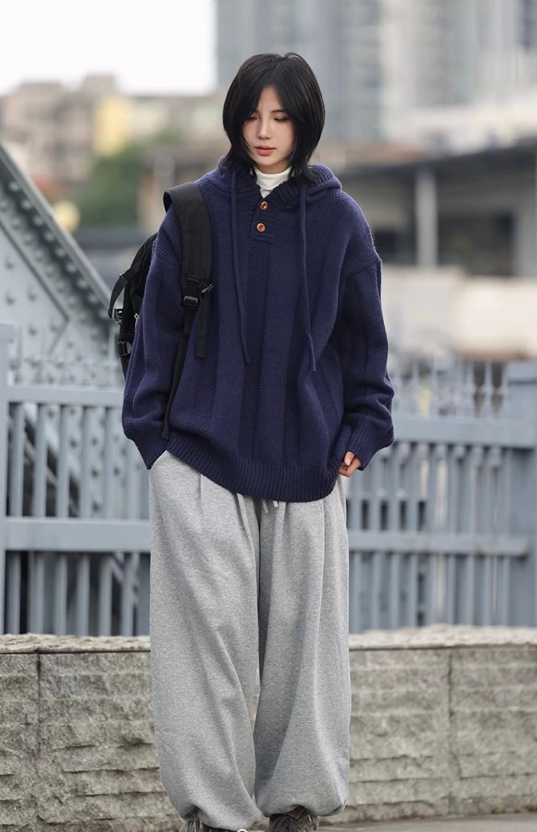 胸元のウッドボタンがさりげないアクセントになり、ブルーは深みのあるトーンで落ち着きを、ブラウンは温もりを感じさせるカラーです。