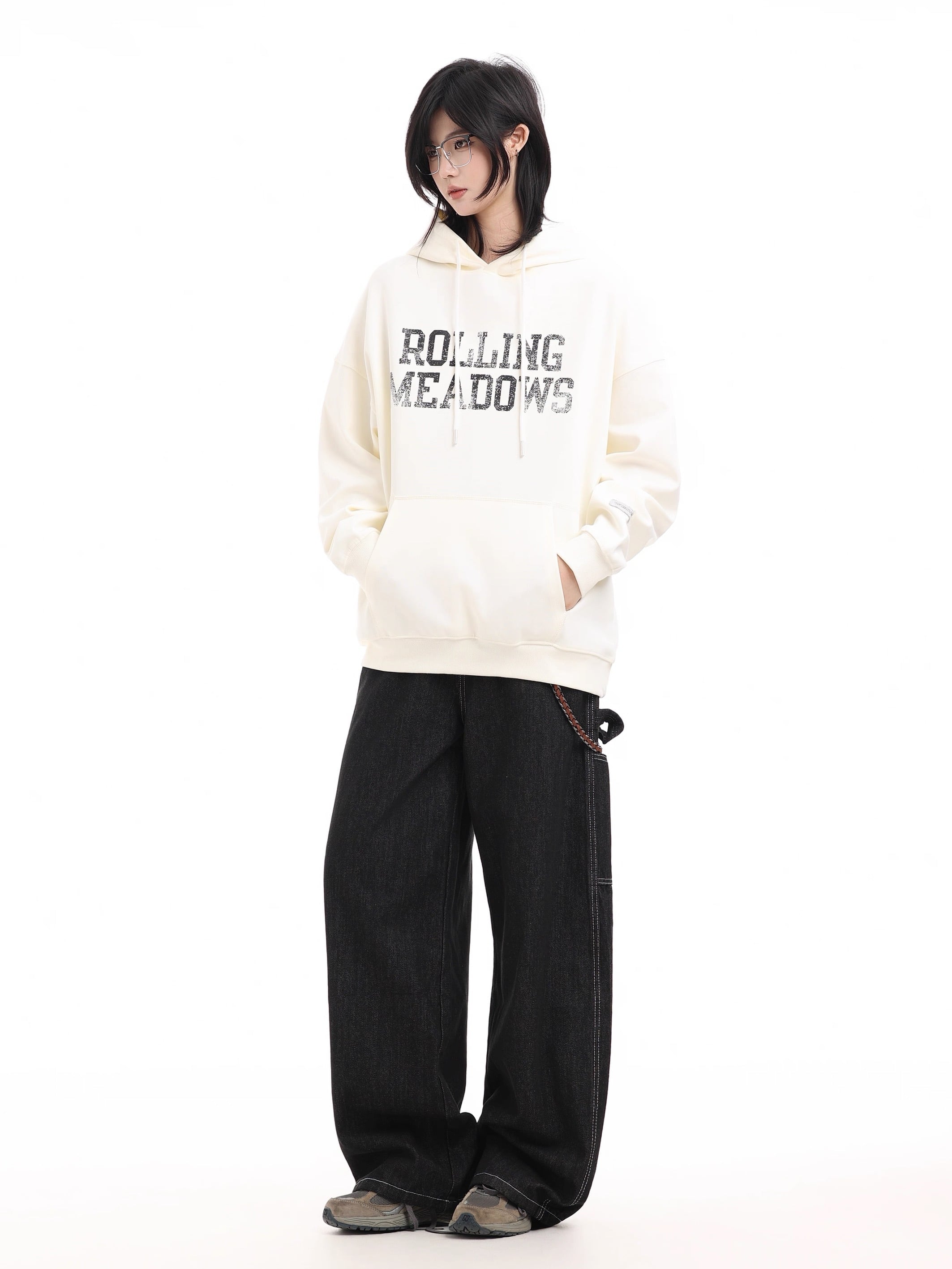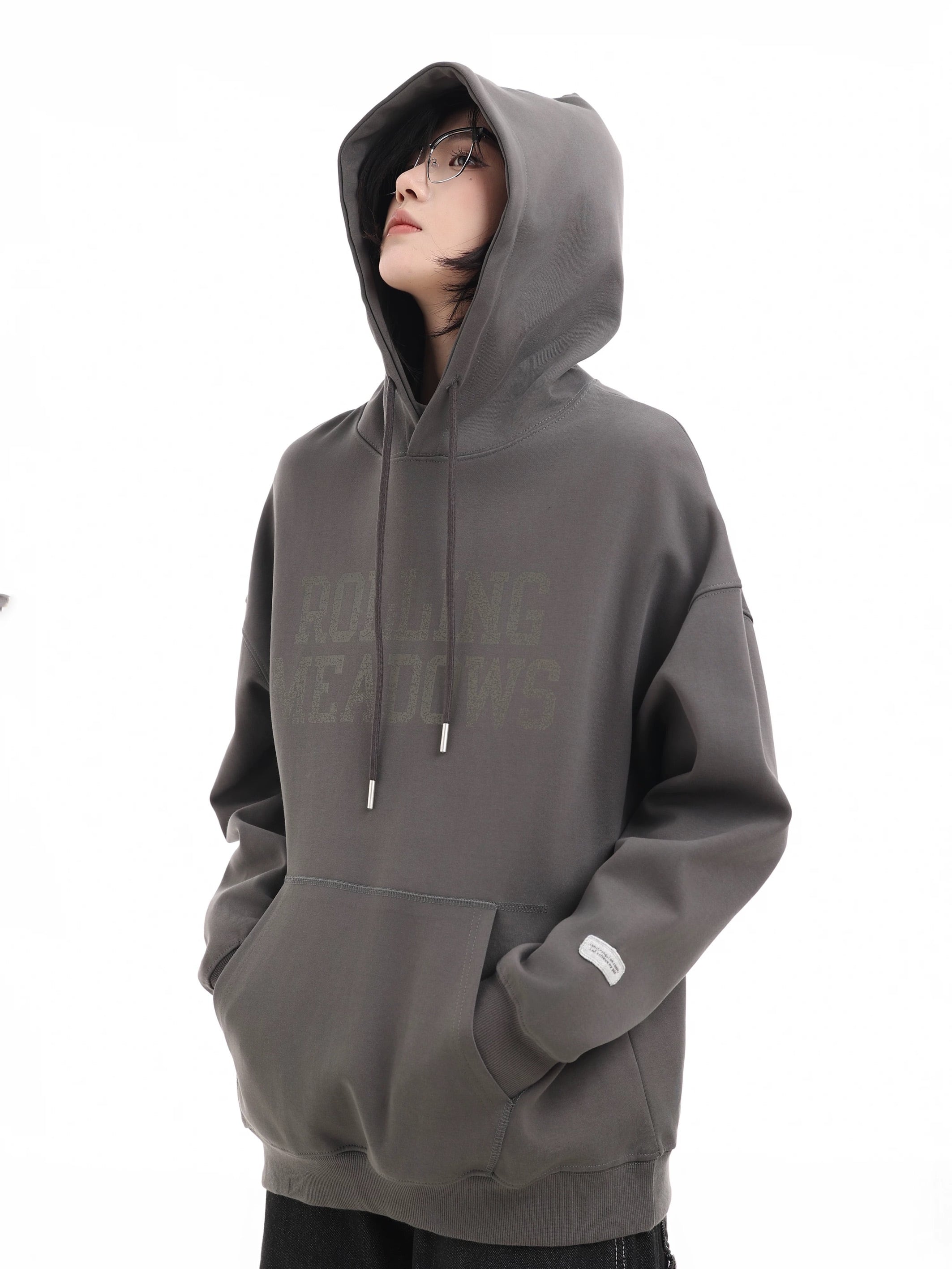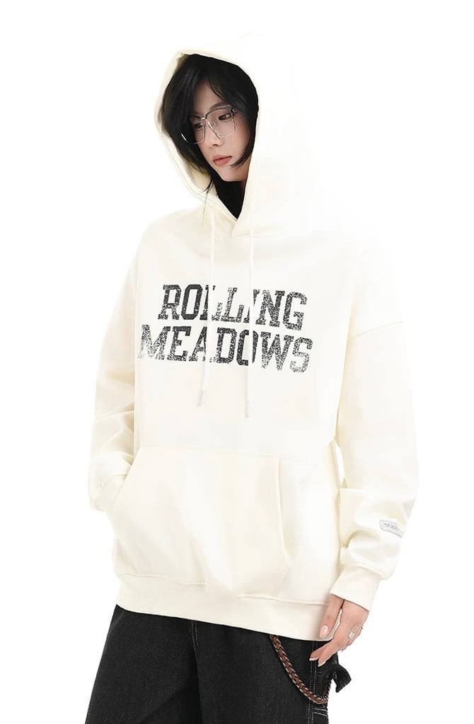 フロントに施された「ROLLING MEADOWS」のビンテージ風ロゴが印象的なオーバーサイズフーディー。