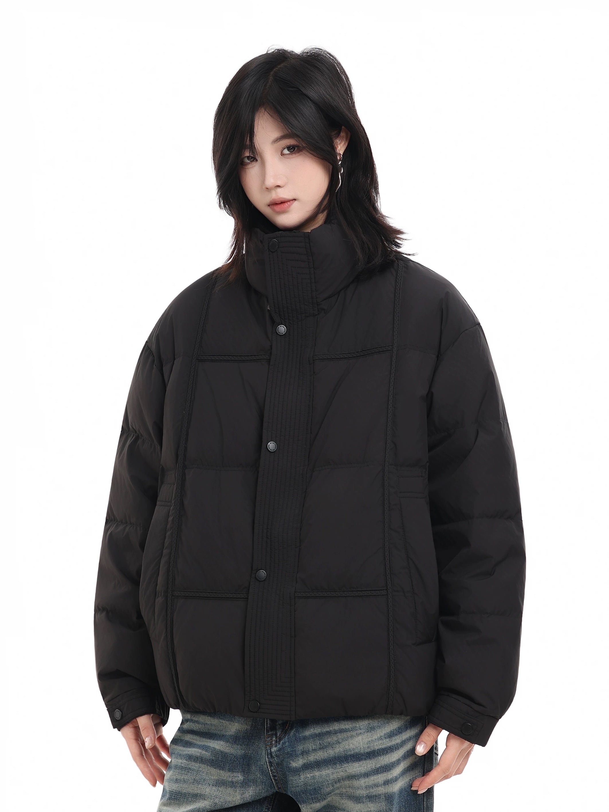 ステッチデザインがさりげない表情を生み、ボリューム感のあるシルエットながらもスッキリとした印象に。