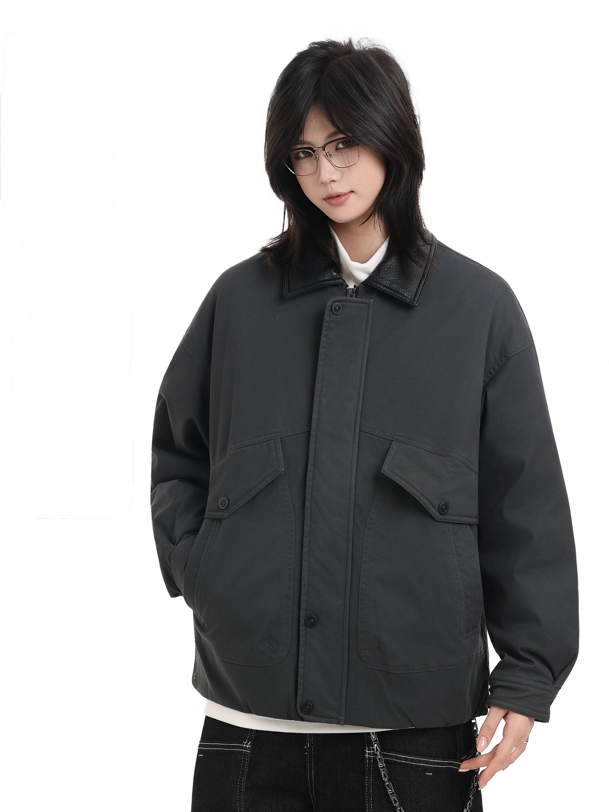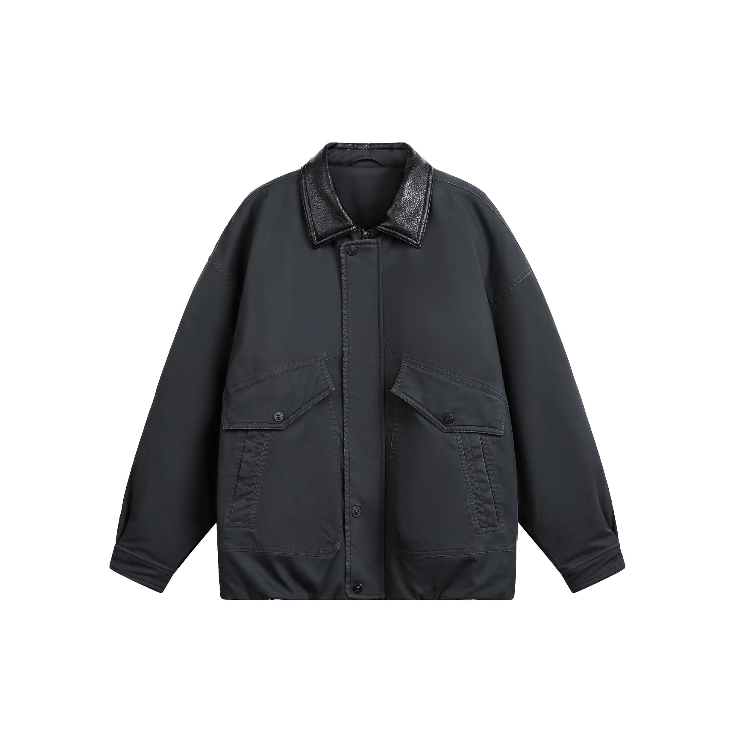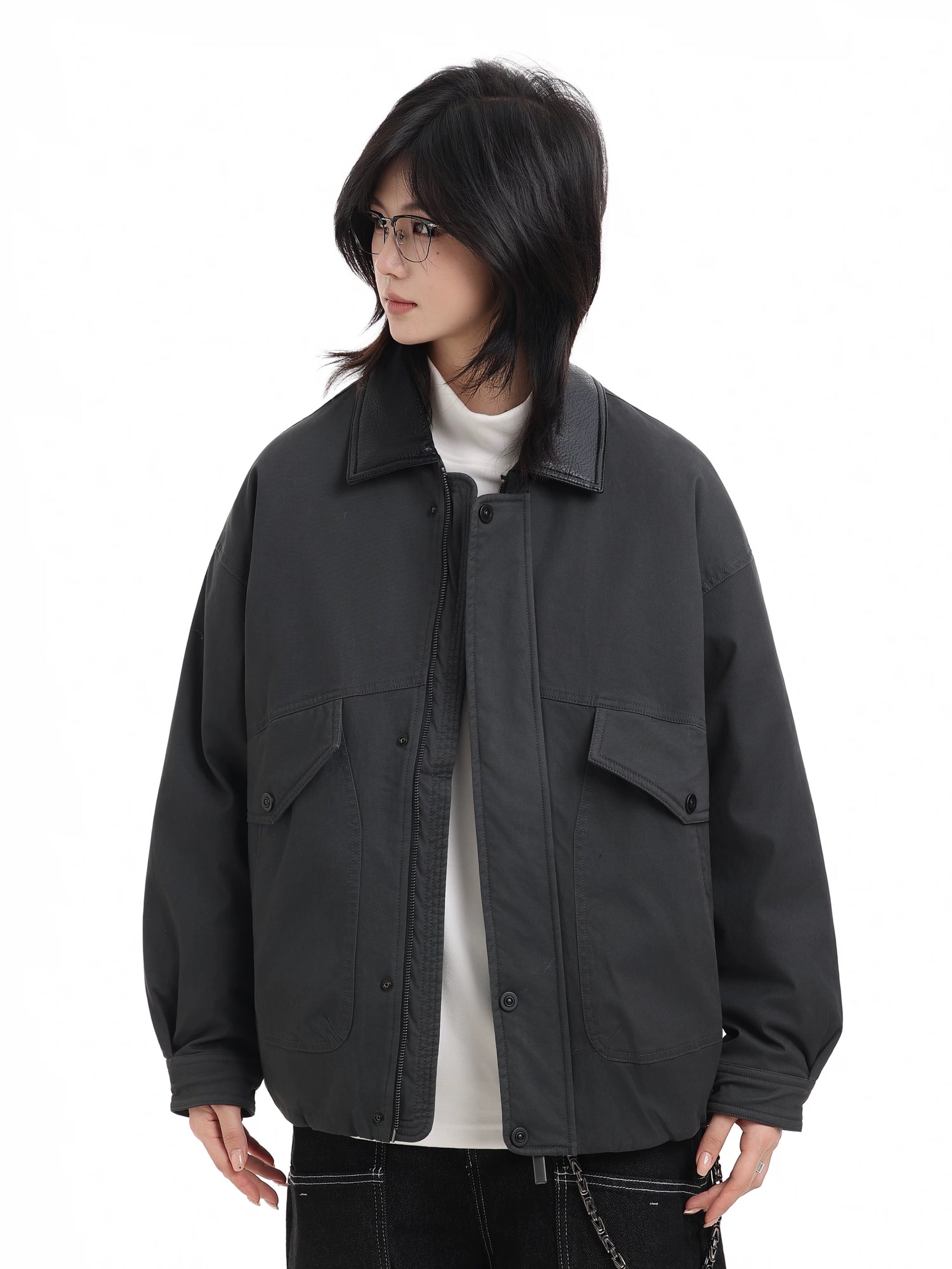 レザールックの切り替え襟、立体的なフラップポケット、比翼仕立てのフロントなど、武骨さと上品さをミックスしたデザインがポイント。