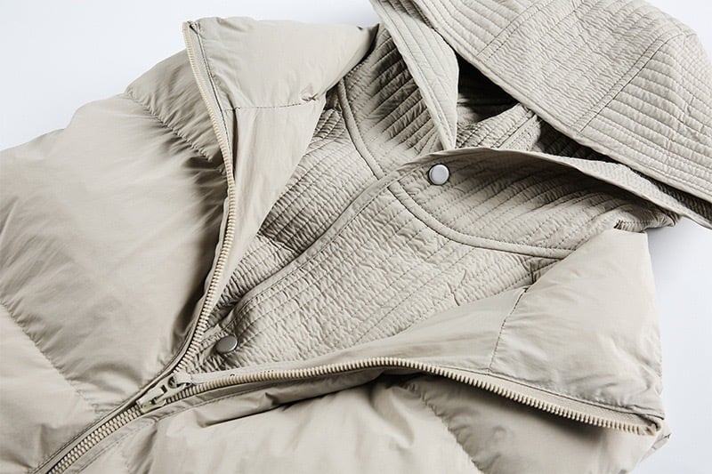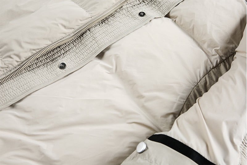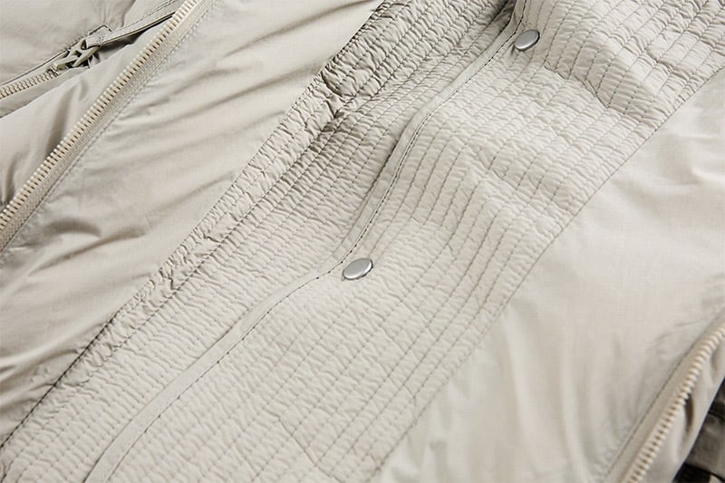 内側にはキルティング仕様のスタンドフードをレイヤードしたデザインを採用。パーカーの上から羽織っても、インナー使いにも対応できる万能モデル。