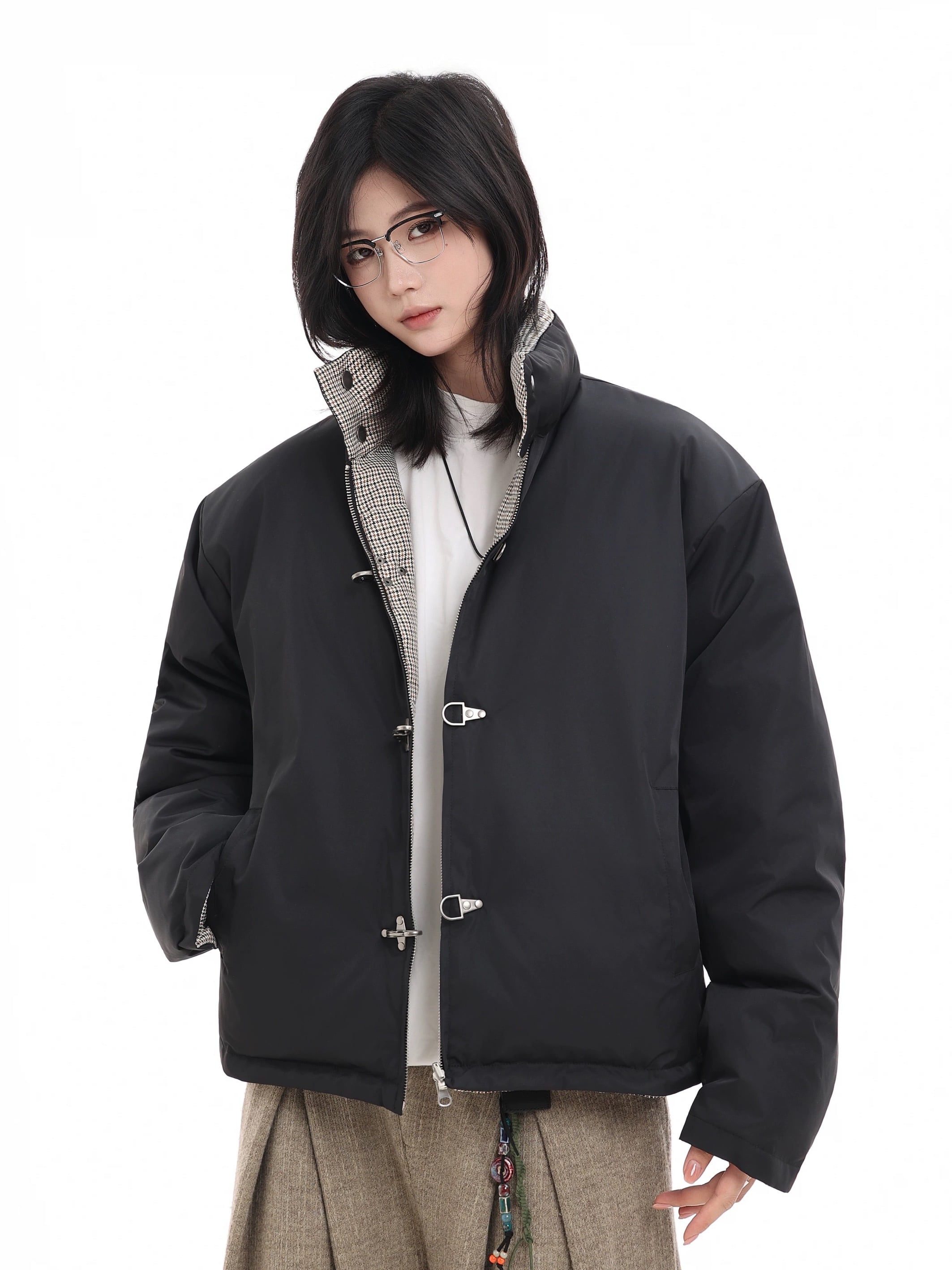 無地面とチェック面を切り替えて着られる、2WAY仕様のパファージャケット。
