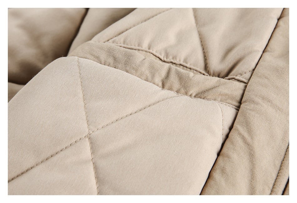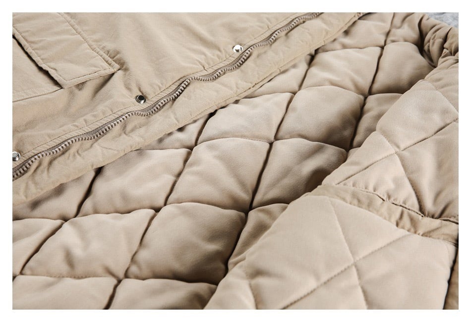 表地はタフなポリエステル素材、内側にはキルティング中綿を採用し、軽さと保温性を両立。