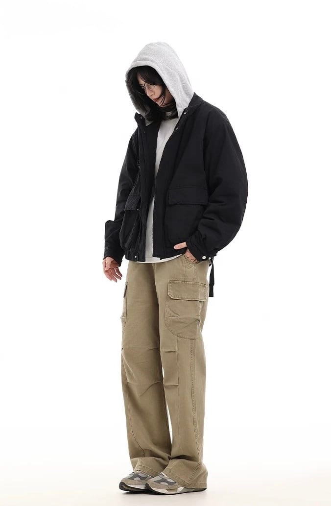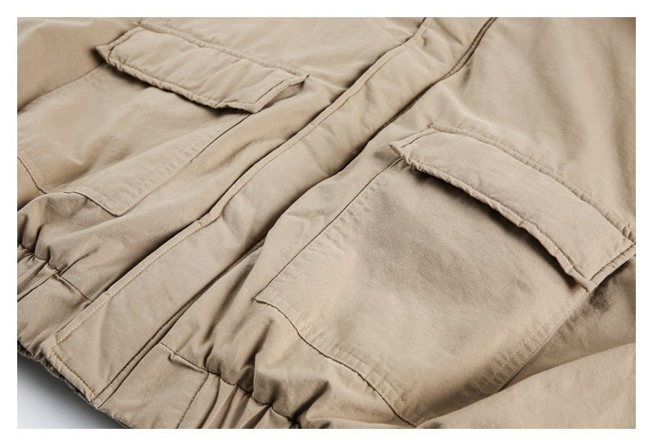フロントには存在感のあるビッグポケットを2つ配置し、胸の内側にもシークレットポケットを備えた実用的な構造です。