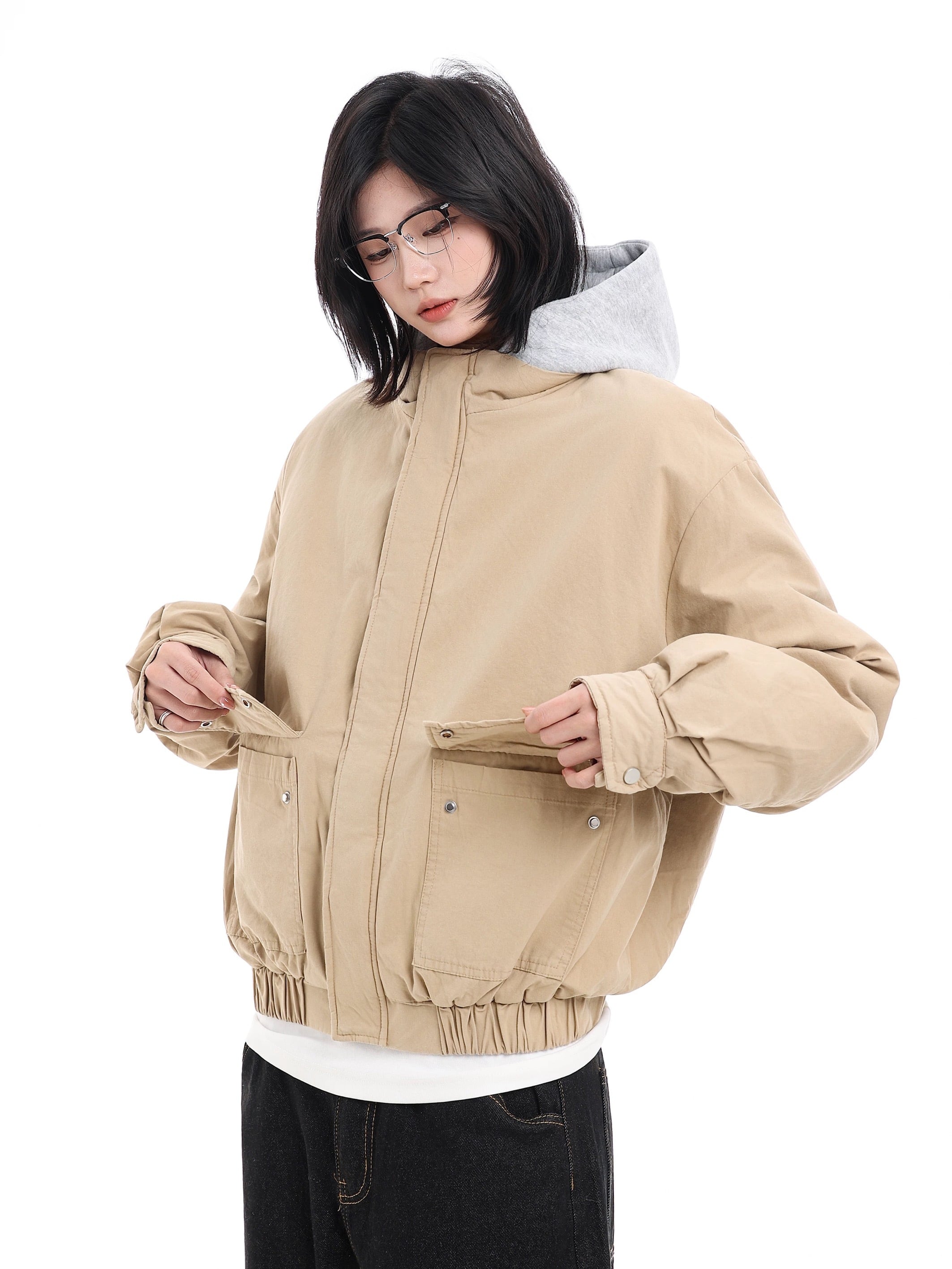 レイヤードしているように見えるフードデザインが特徴の、フェイクツーピースジャケット。