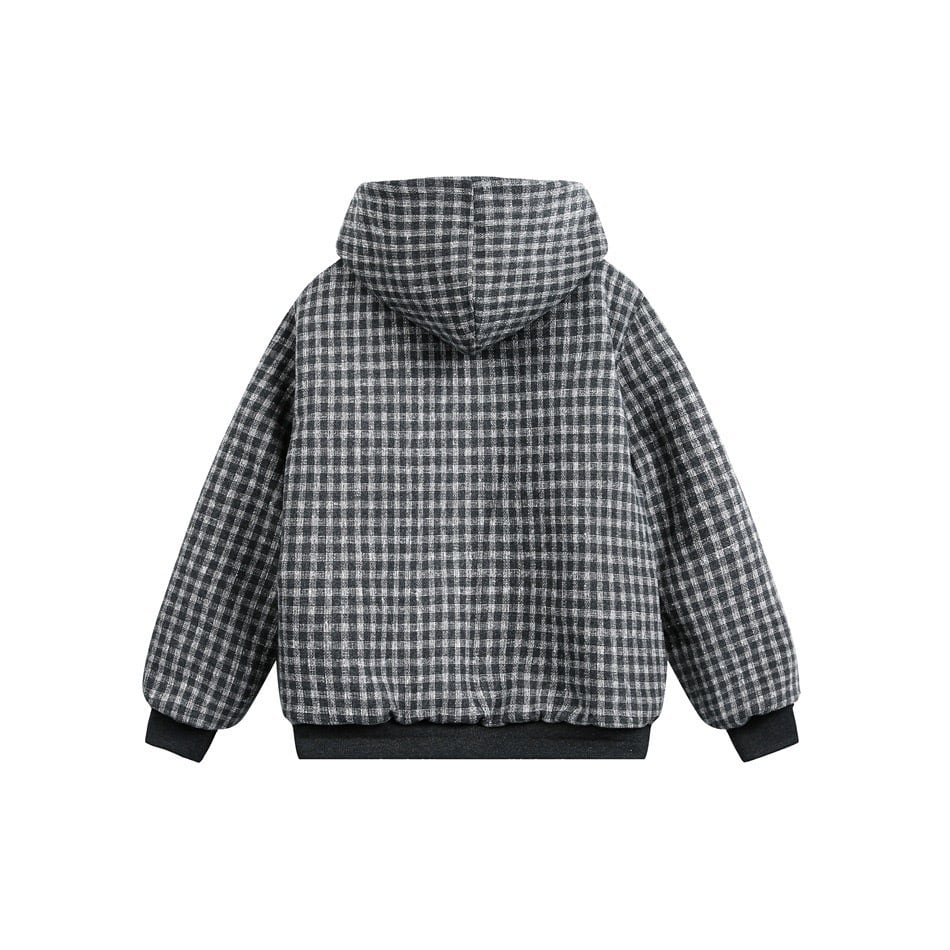 柔らかなウールタッチ素材で仕上げたチェック柄フードブルゾン。