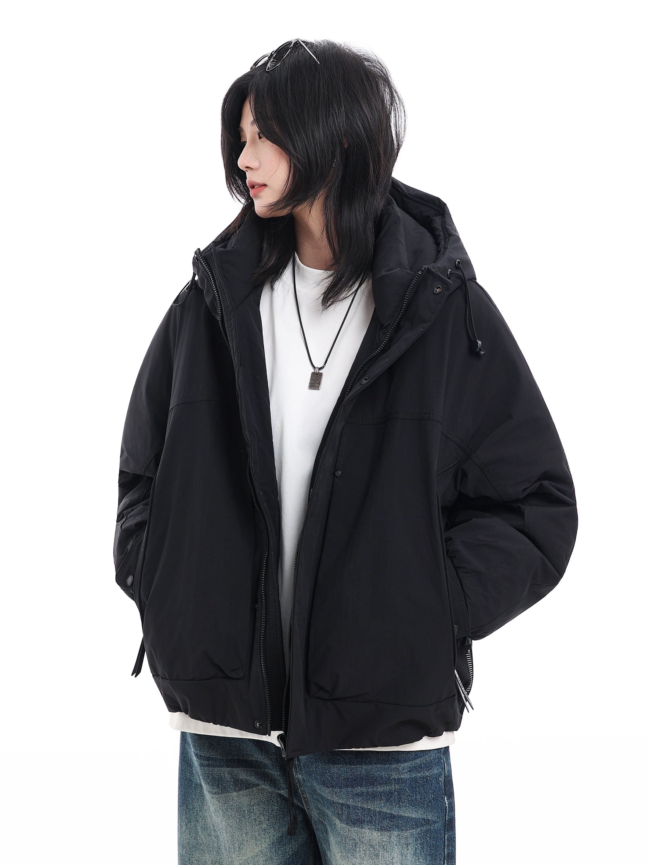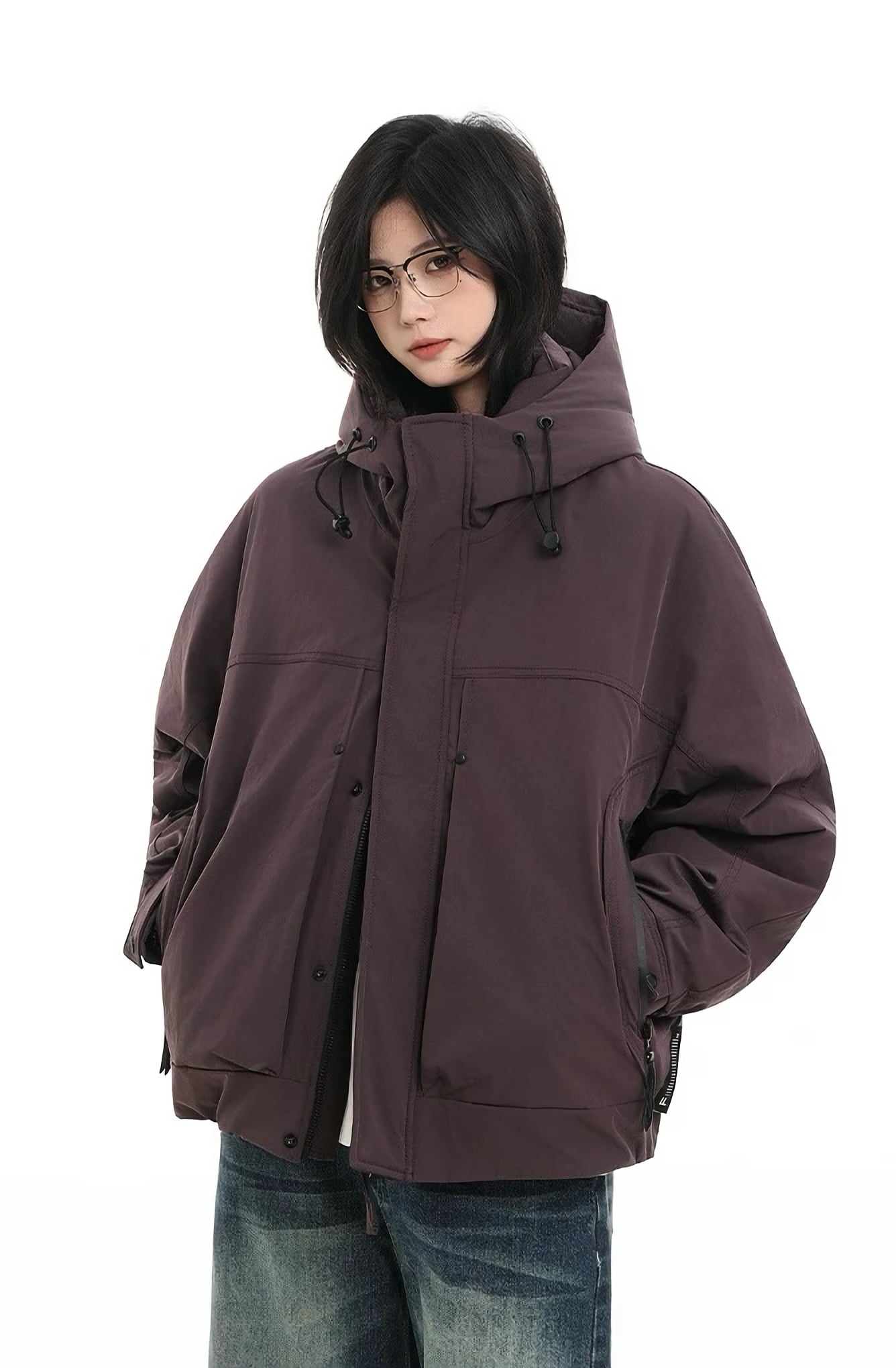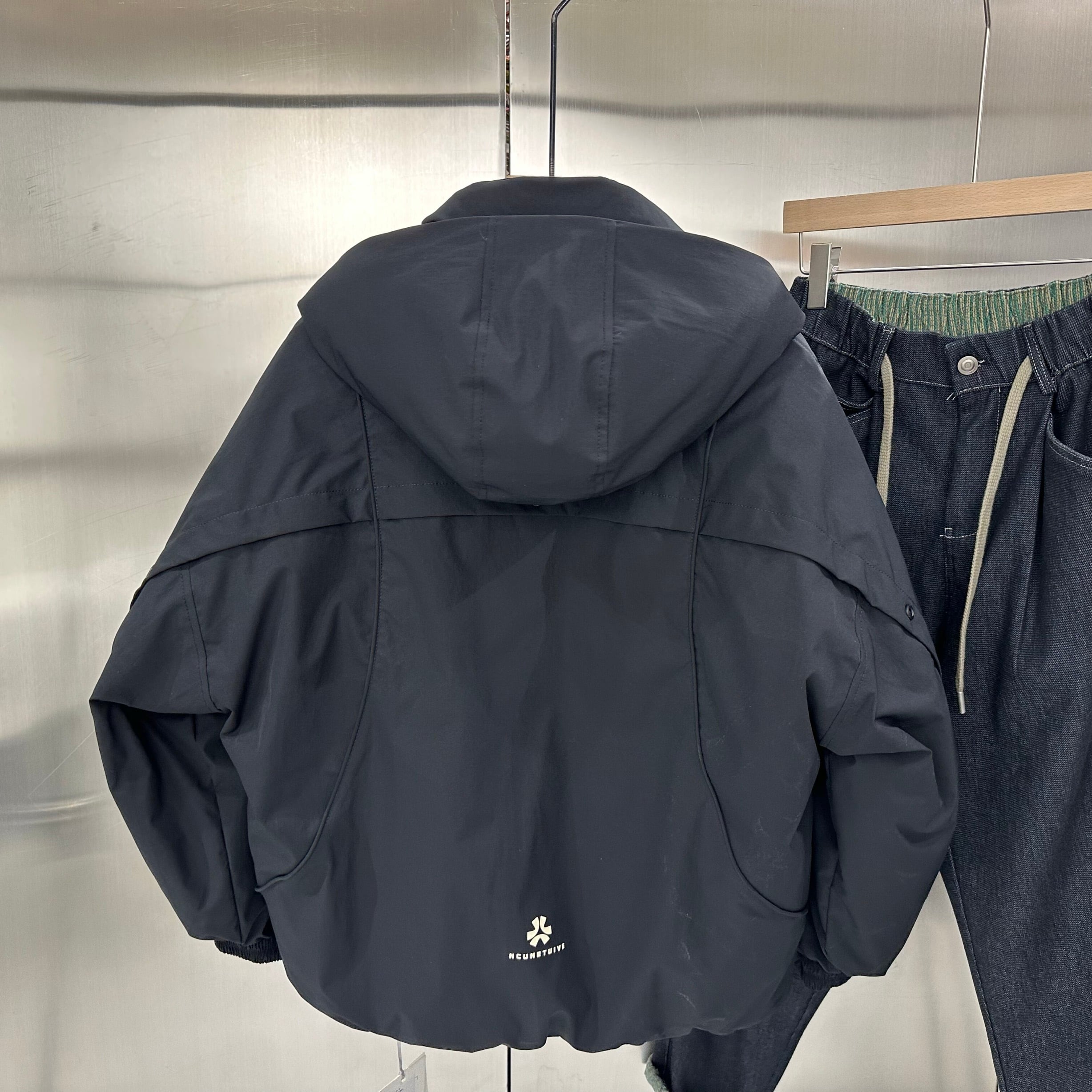 立体的なフードとドローコードによって、シルエット調整から防寒まで細かなコントロールが可能です。