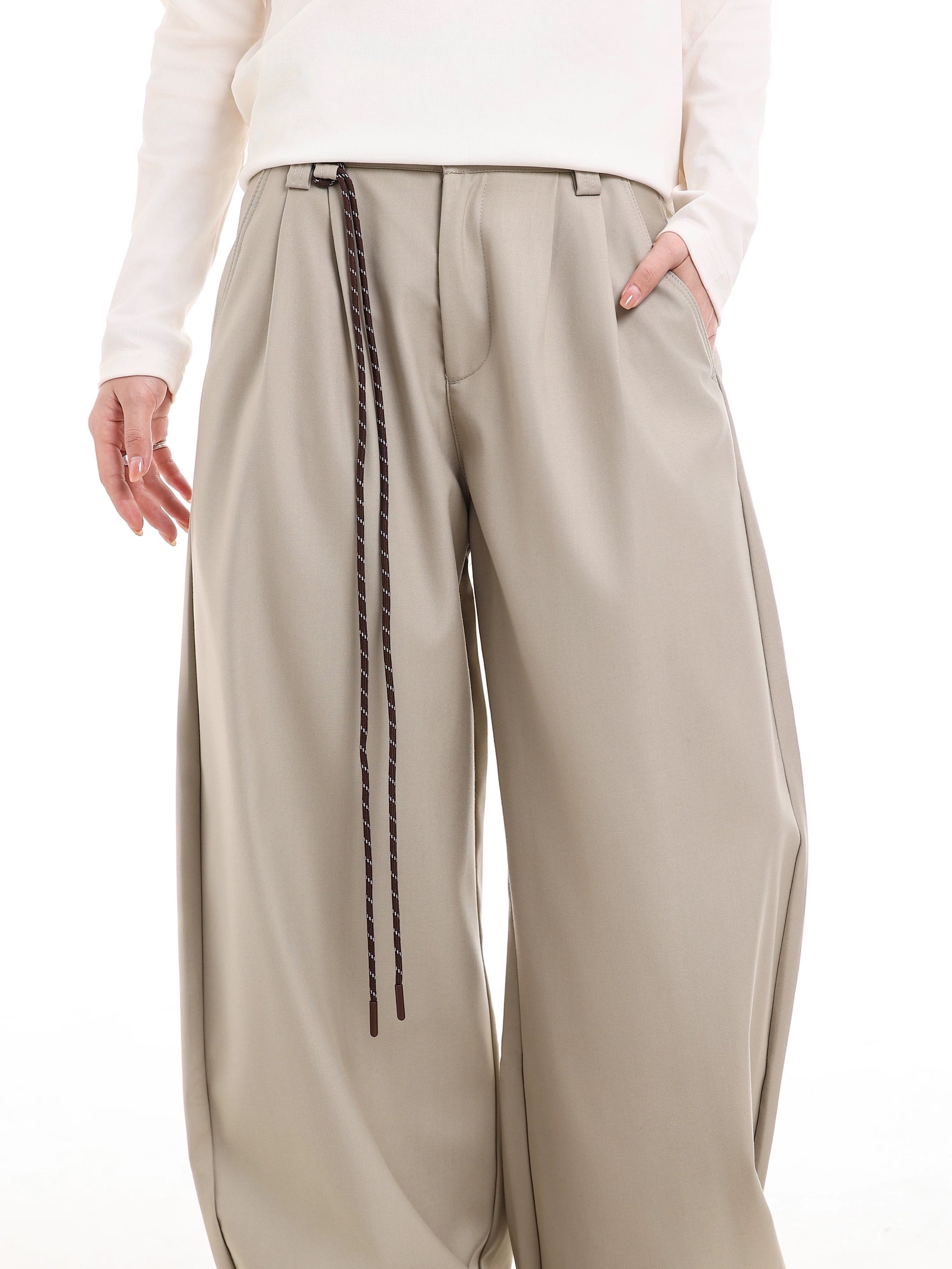 フロントに垂らしたドローストリング(紐)がアクセントになる、タック入りワイドスラックス。