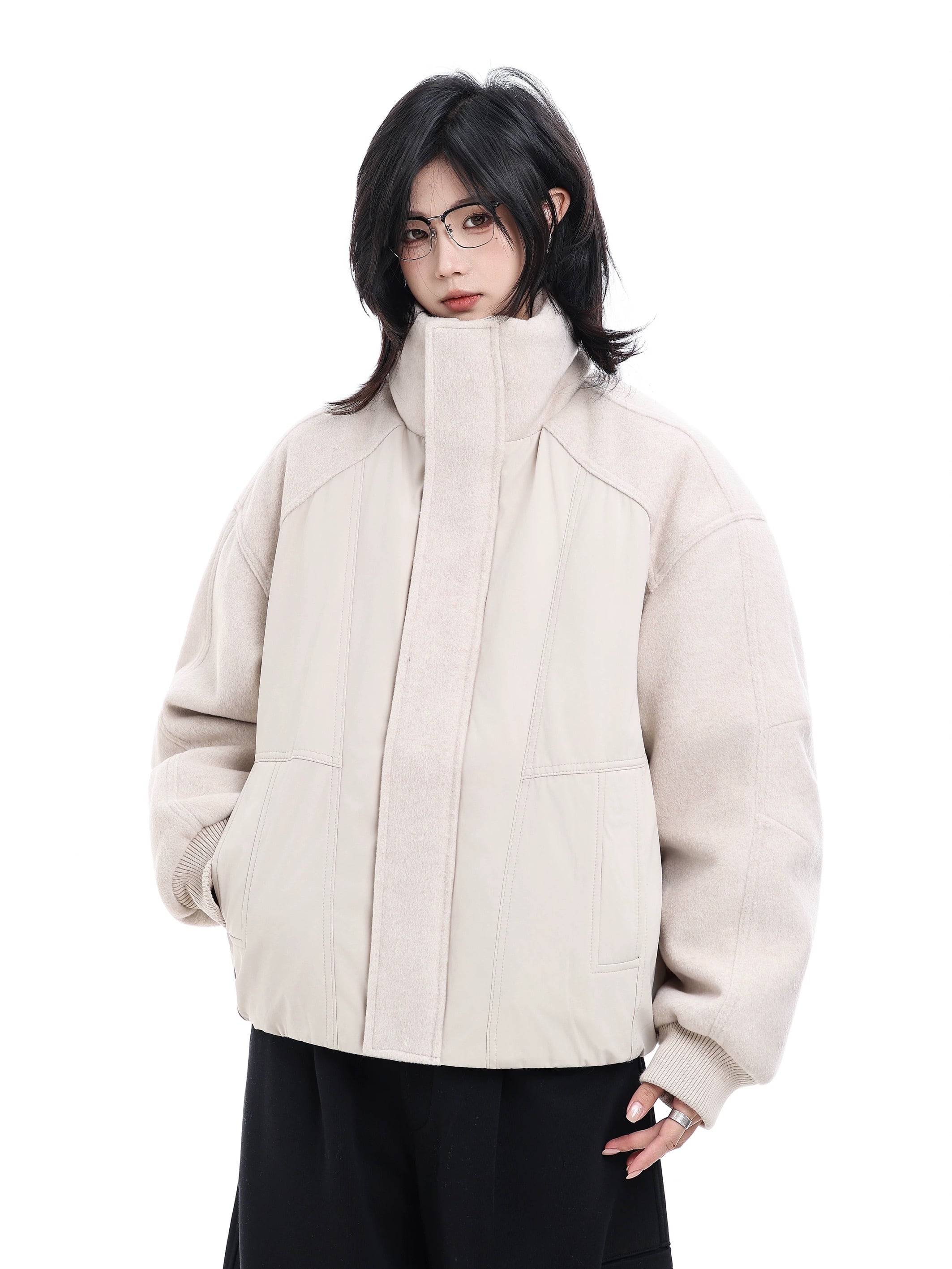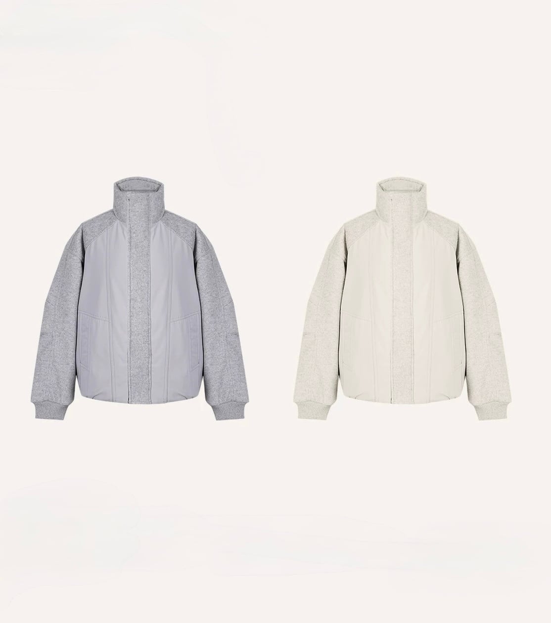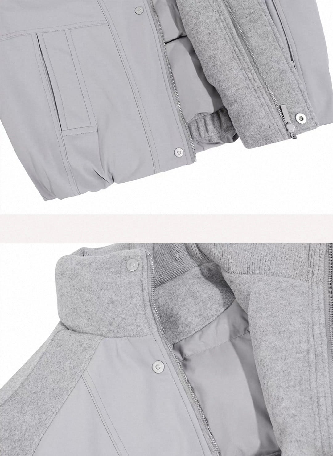 異素材を組み合わせたレイヤードデザインが特徴のダウンジャケット。