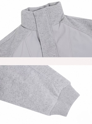 フロントにはマットな質感のポリエステル素材、袖やネック周りにはフェルト調の生地を採用し、立体感と奥行きのある表情に仕上げました。