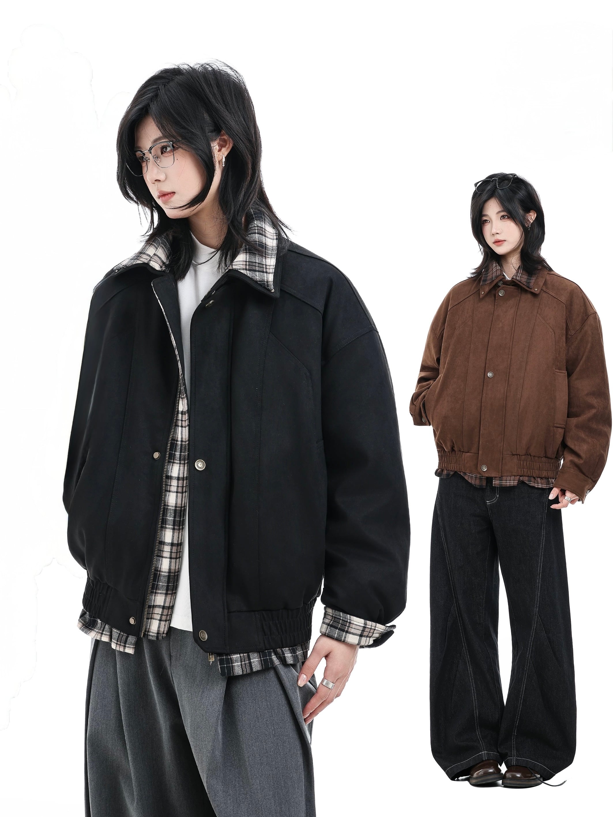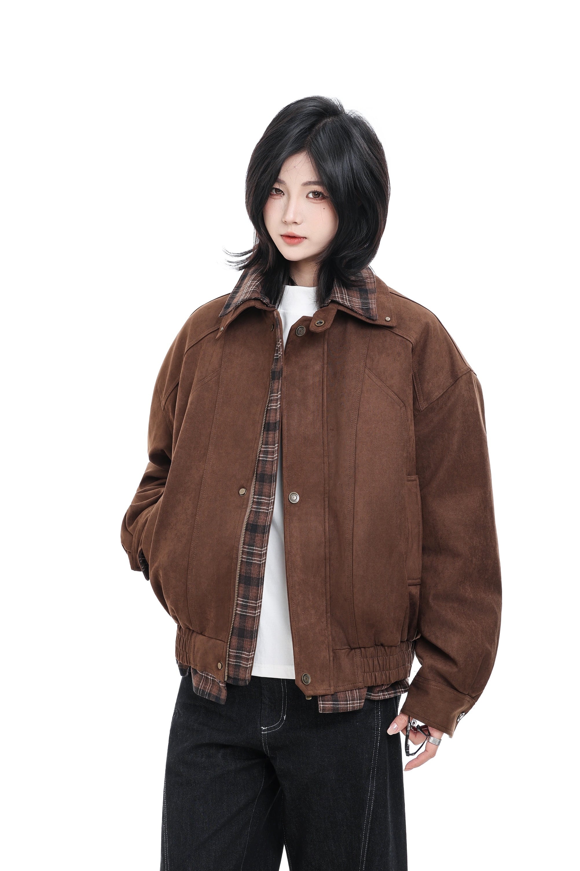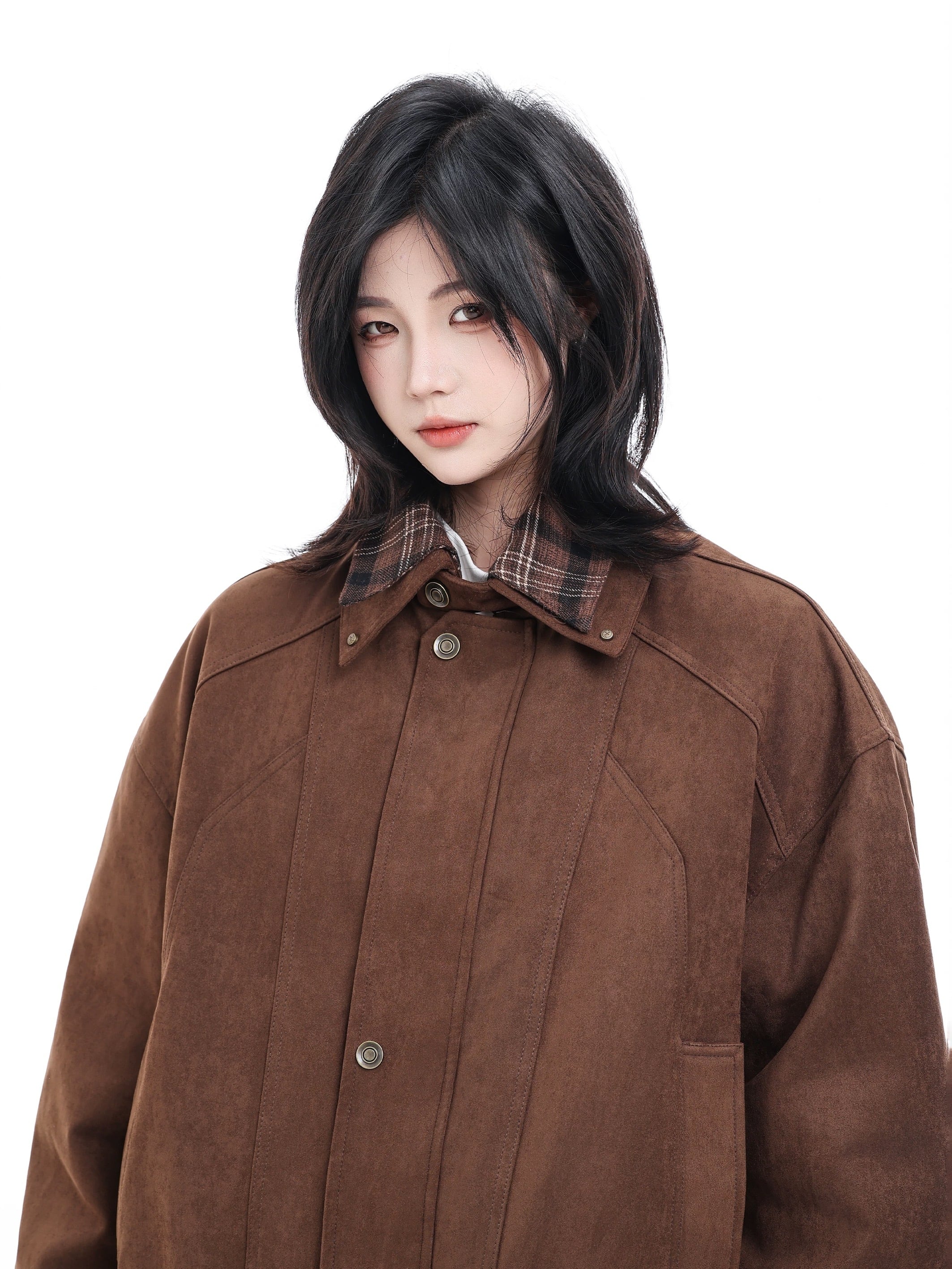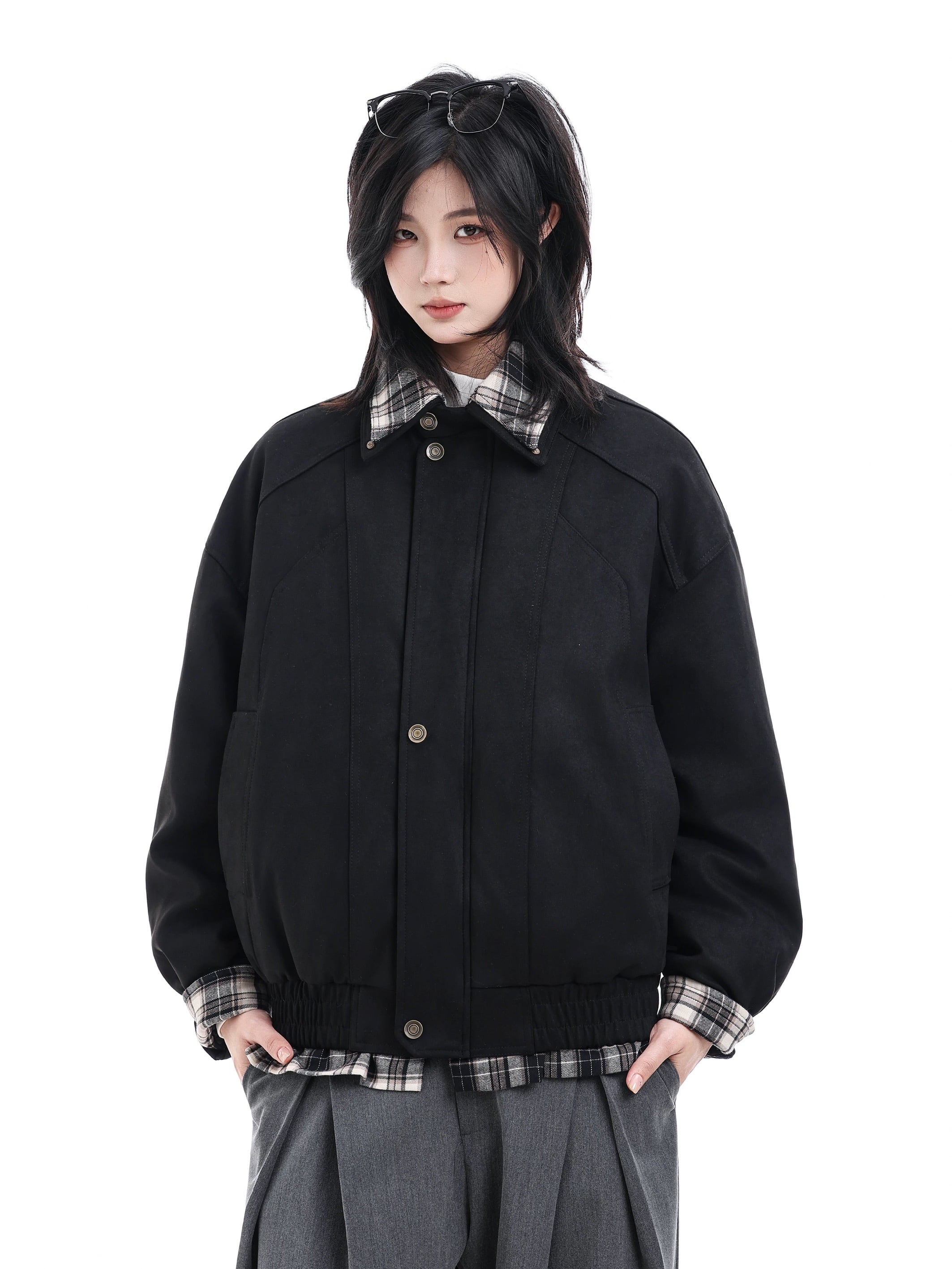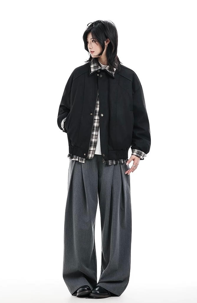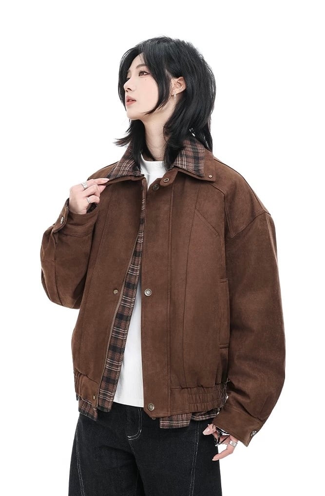 首元や袖口、裾から覗くチェック柄ライニングが、さりげないアクセントとして機能します。