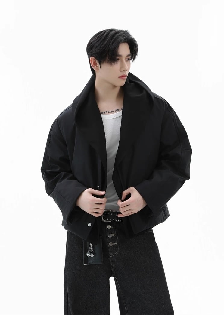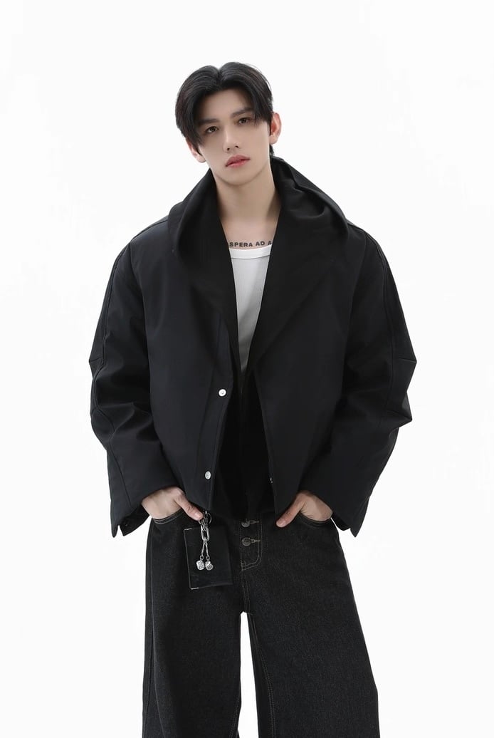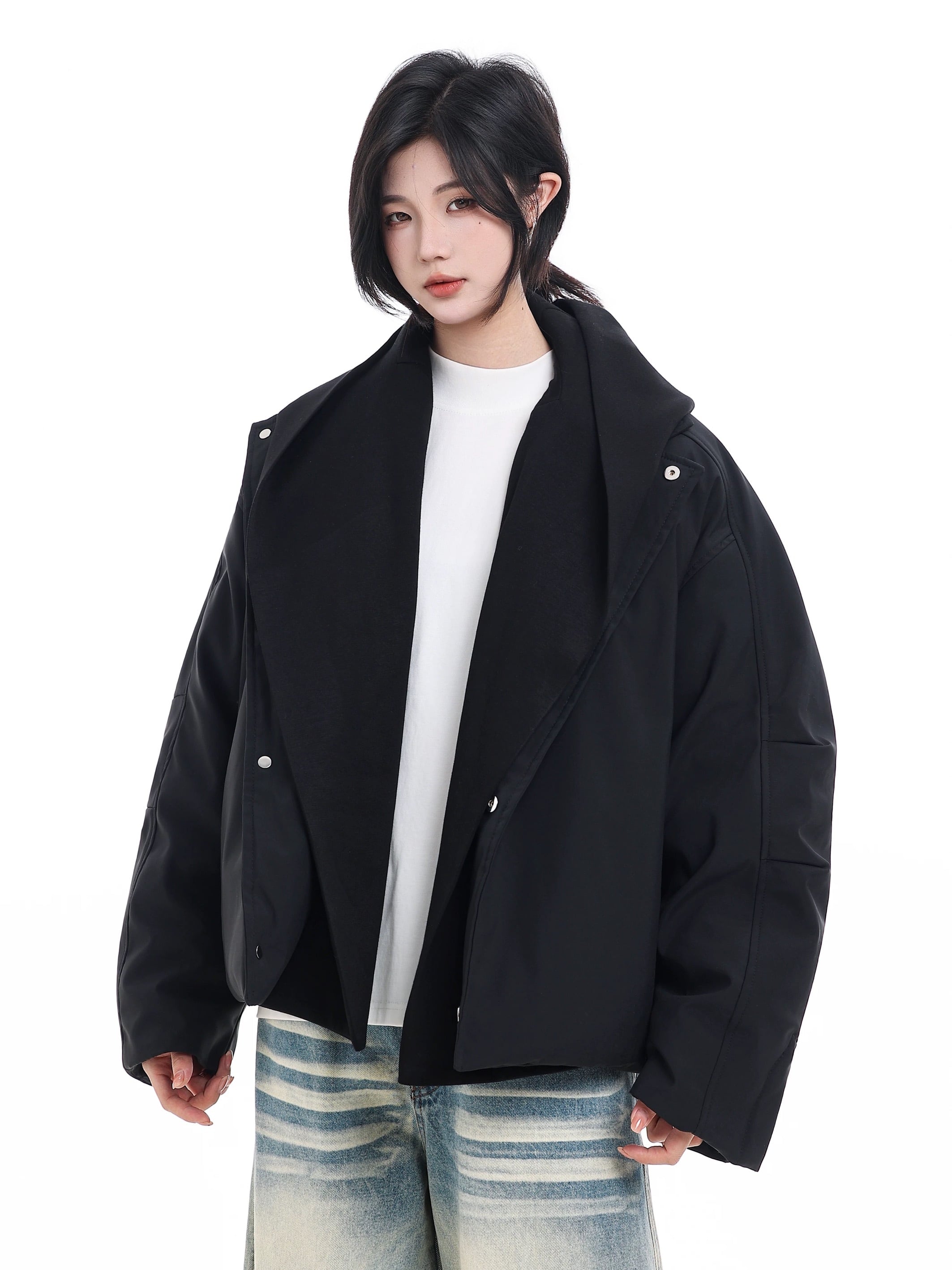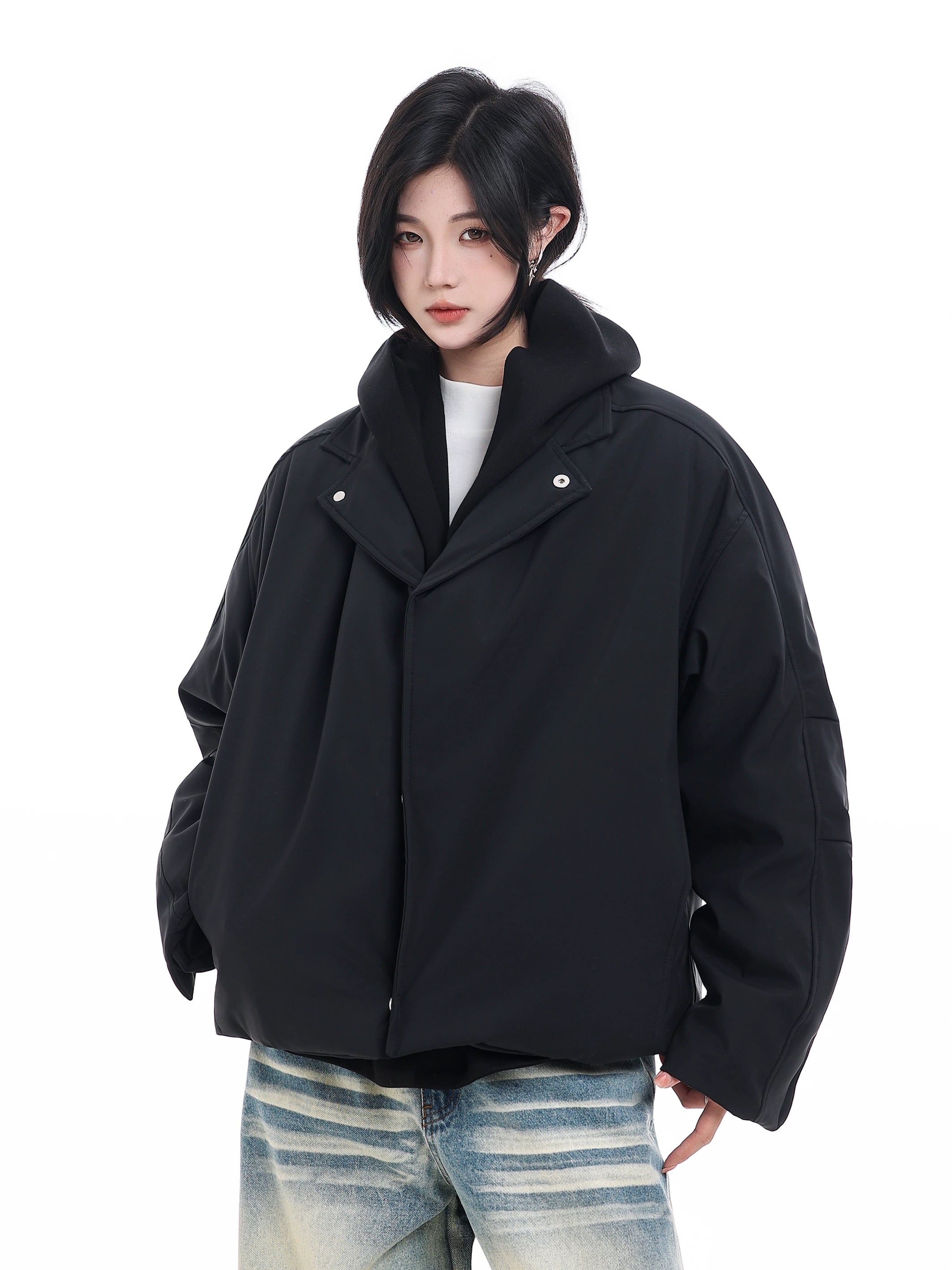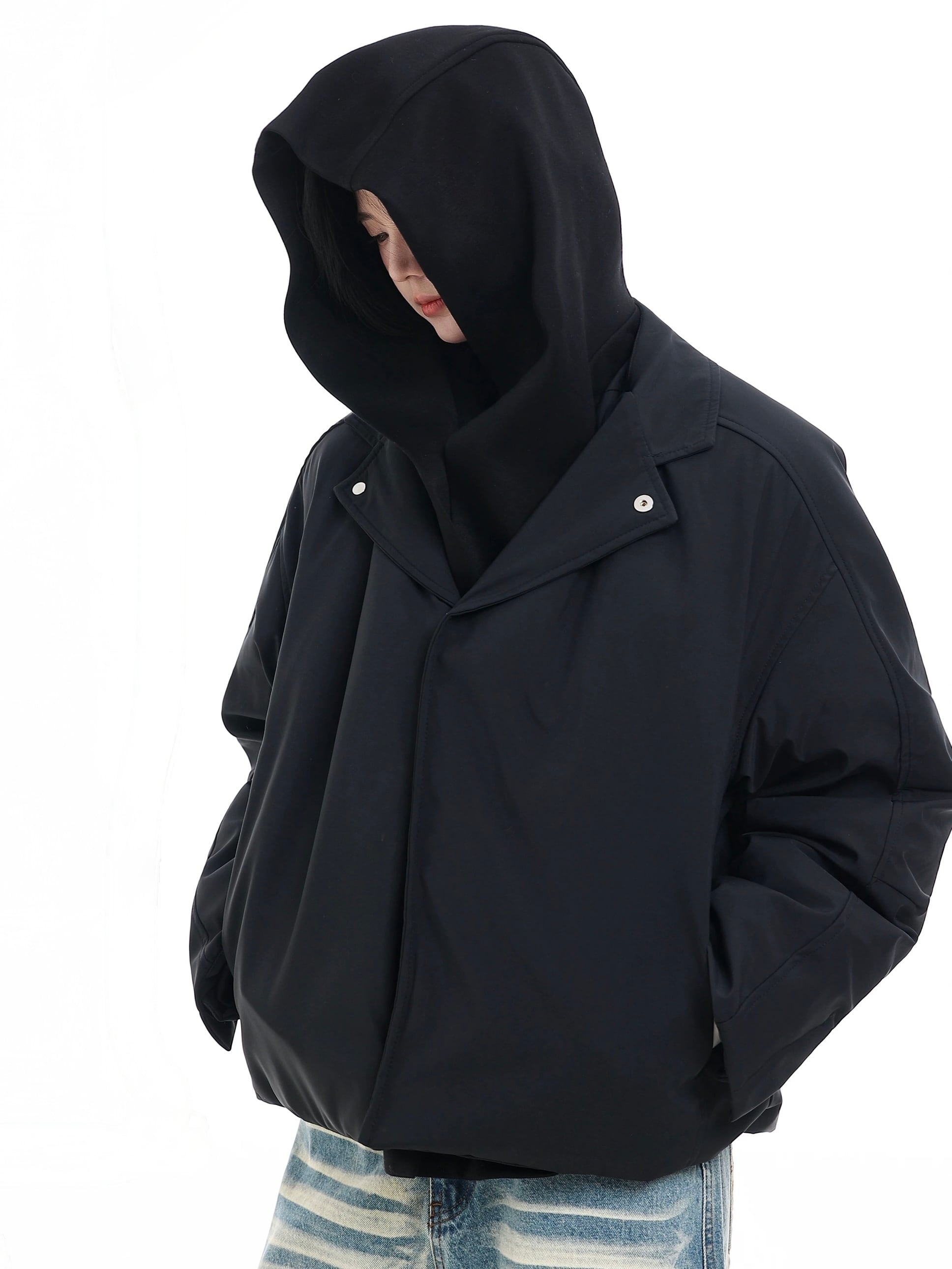 ボタンを開けるとフードが前に流れ落ち、柔らかくラフな表情へと変化し、