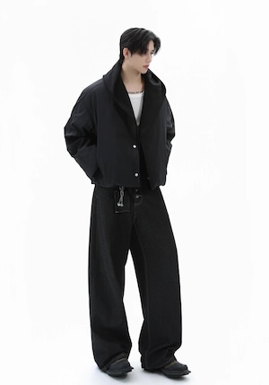 フロントのボタンを留めた状態では、フードが強調されたミニマルで構築的な印象に。
