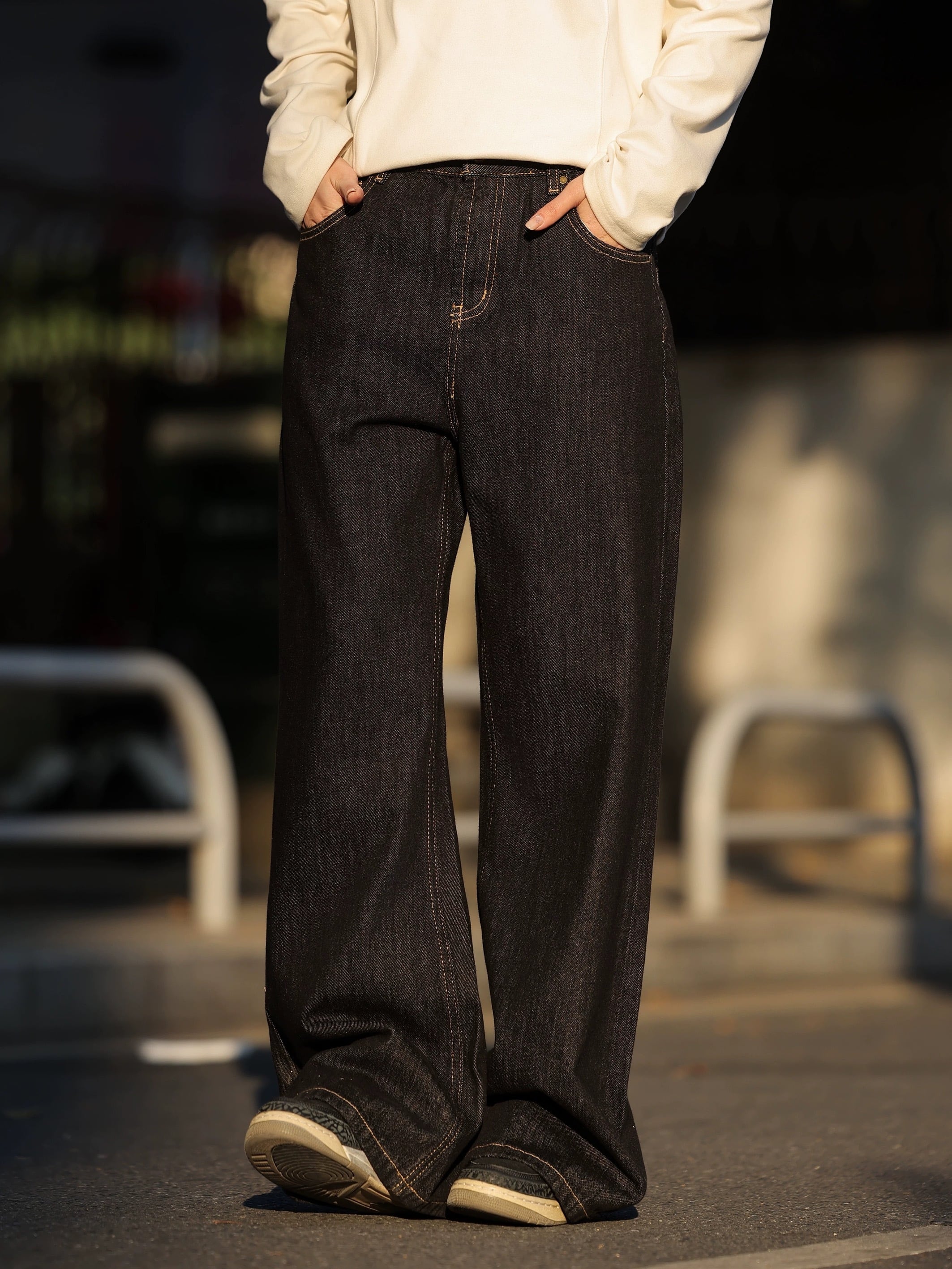 無駄を削ぎ落としたデザインと、落ち着いた色味が印象的なワイドストレートデニム。