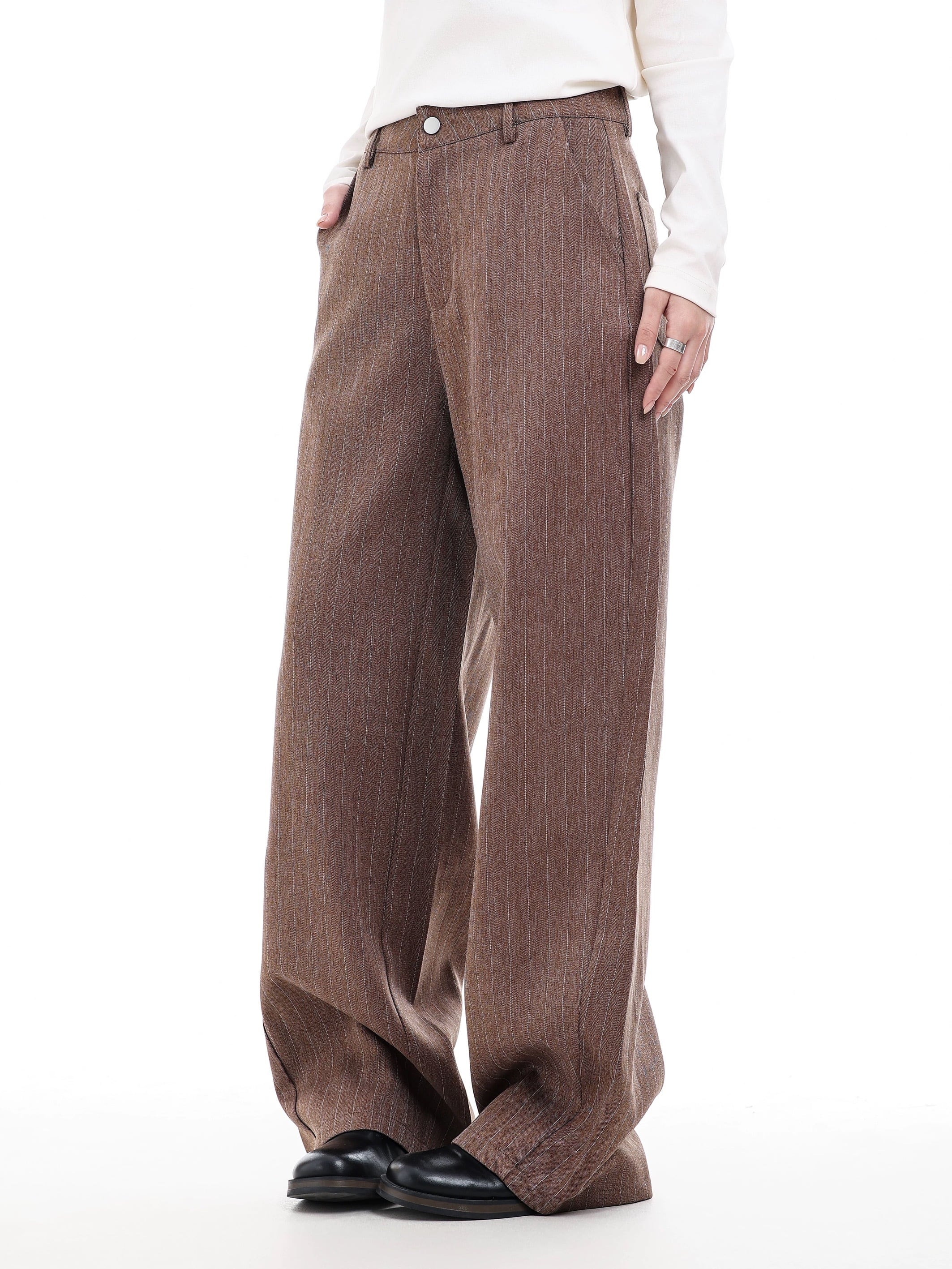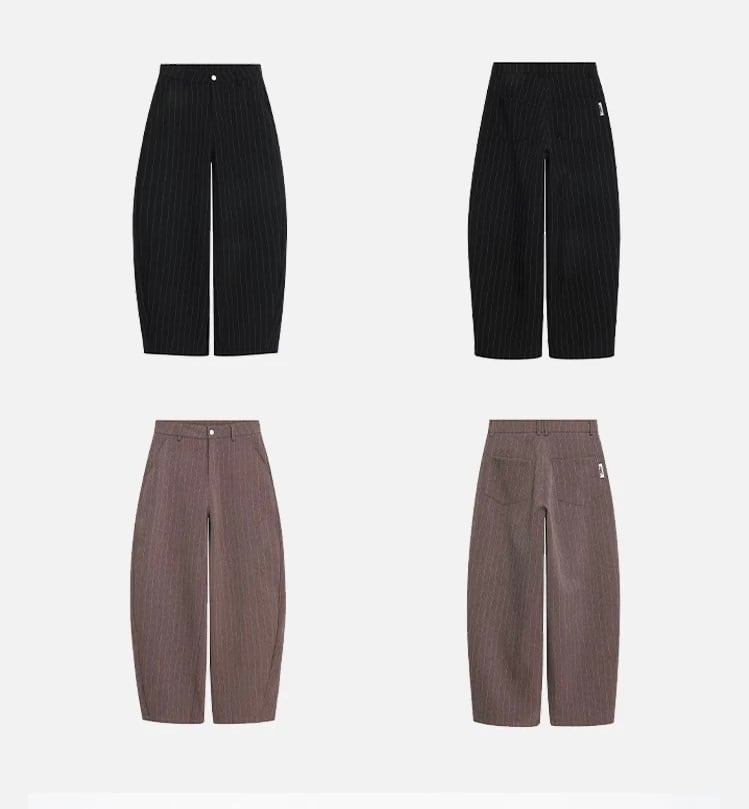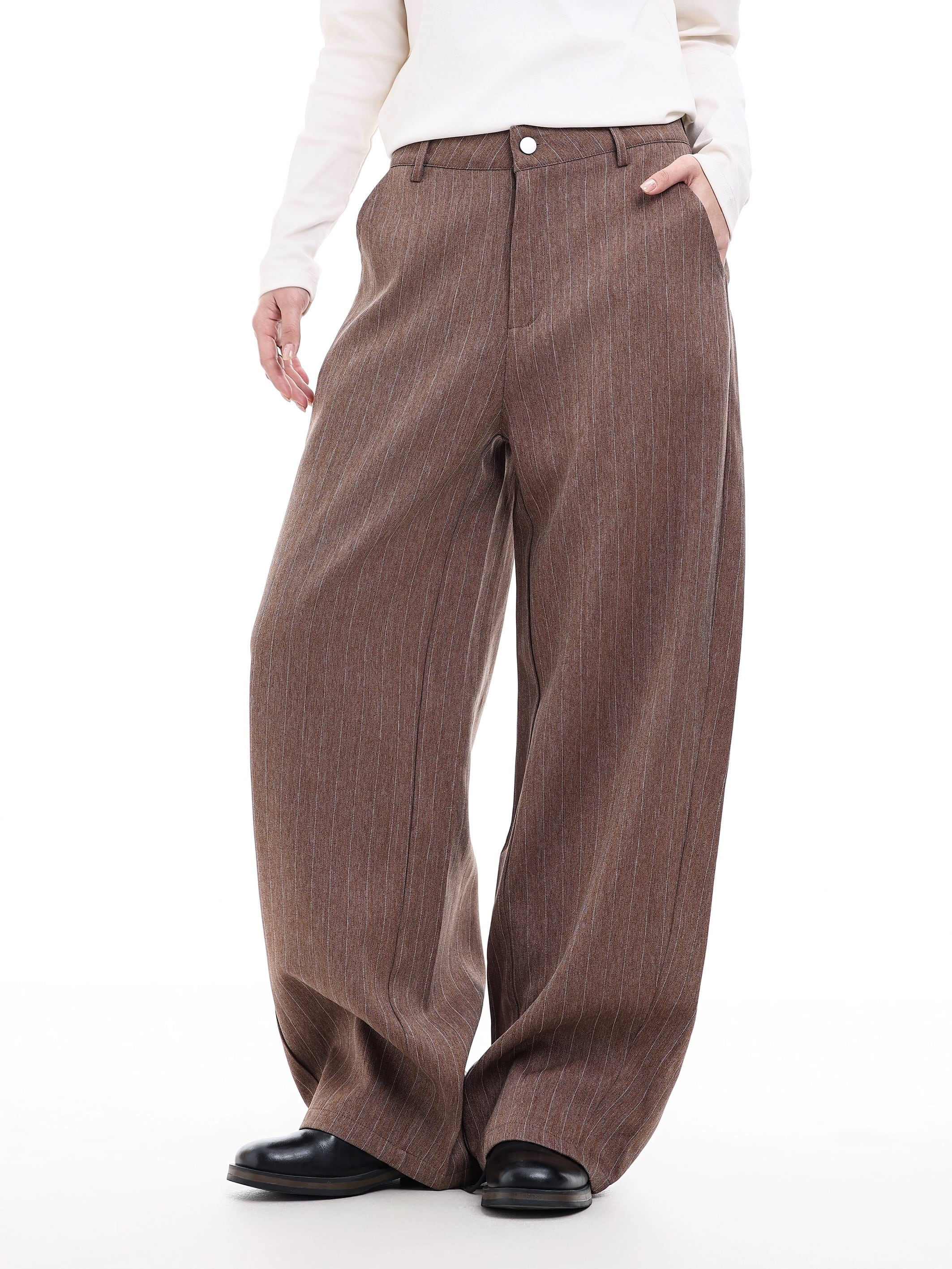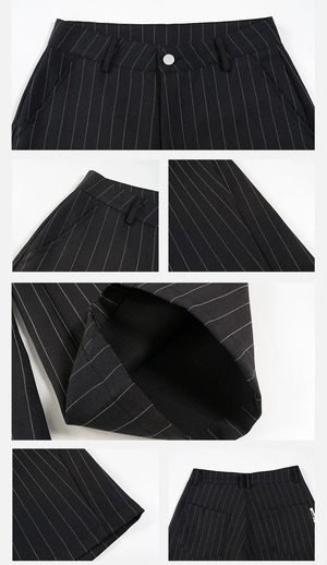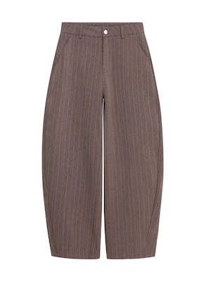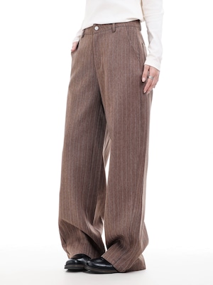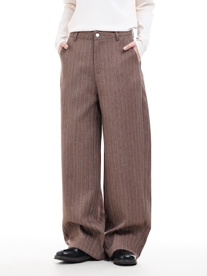落ち着いたストライプ柄と、静かな存在感を持つワイドシルエットが特徴のスラックスパンツ。