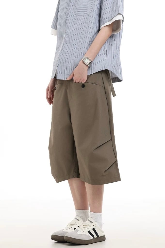 膝下までの長めの丈感が特徴のワイドハーフパンツ。