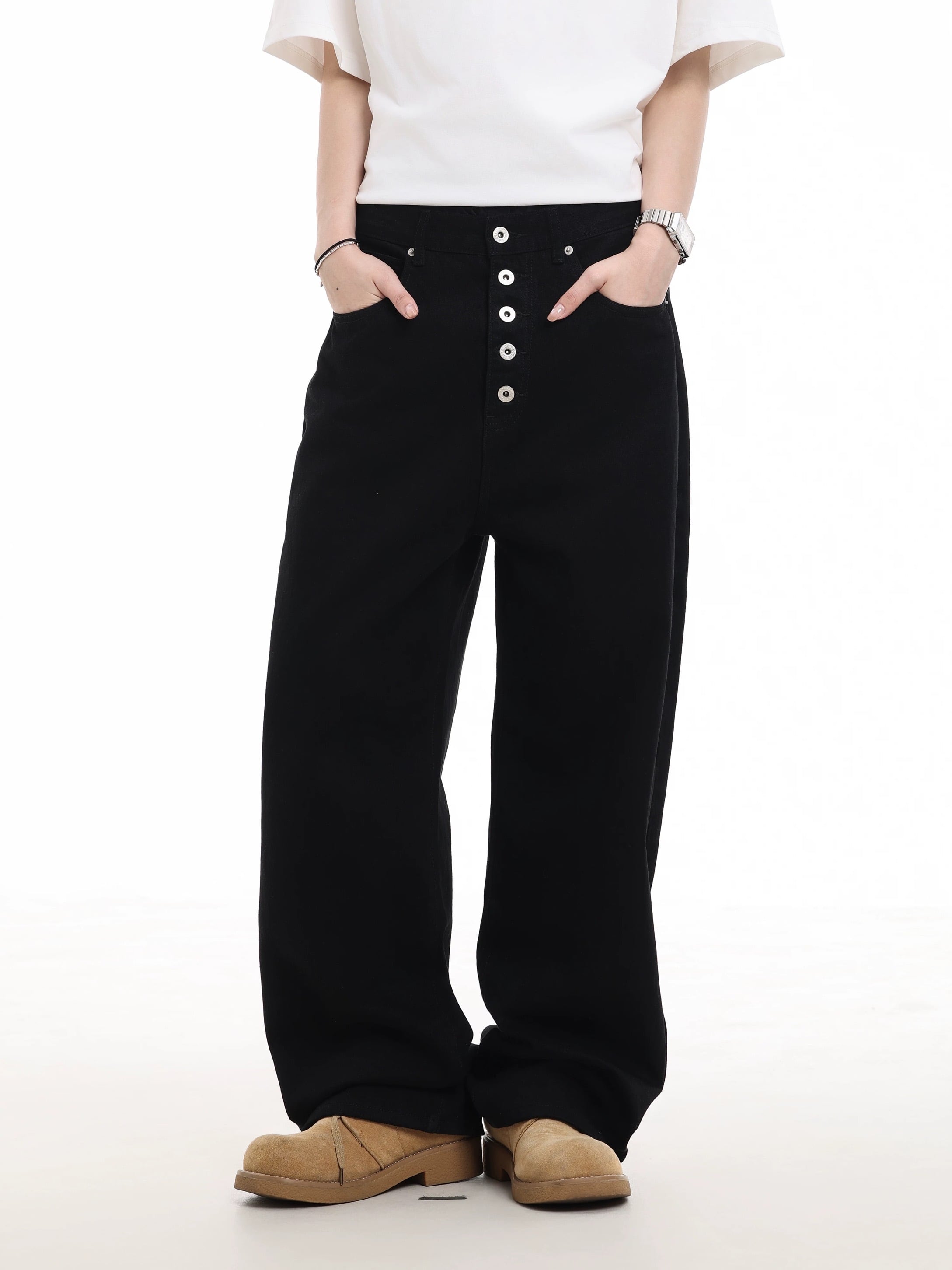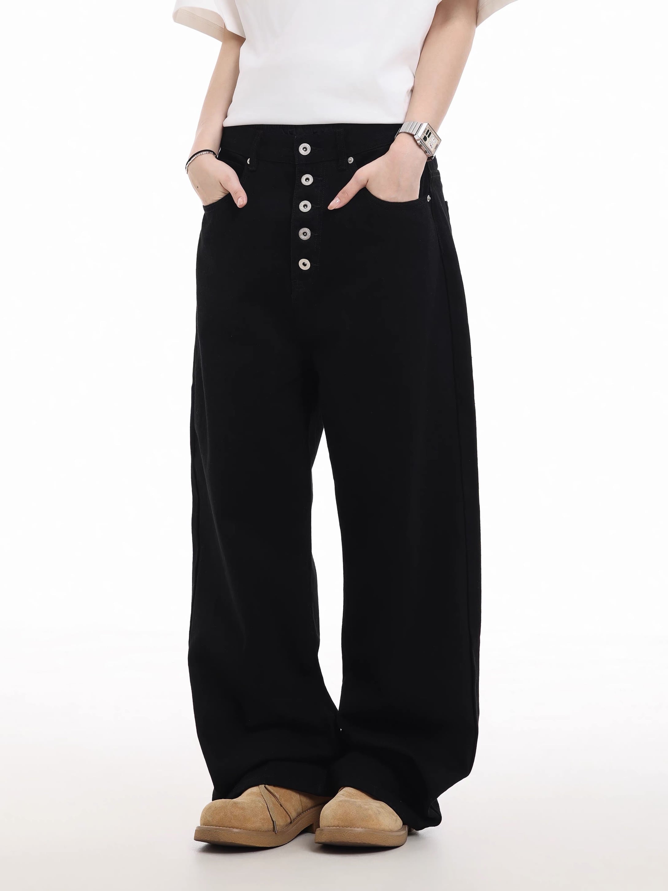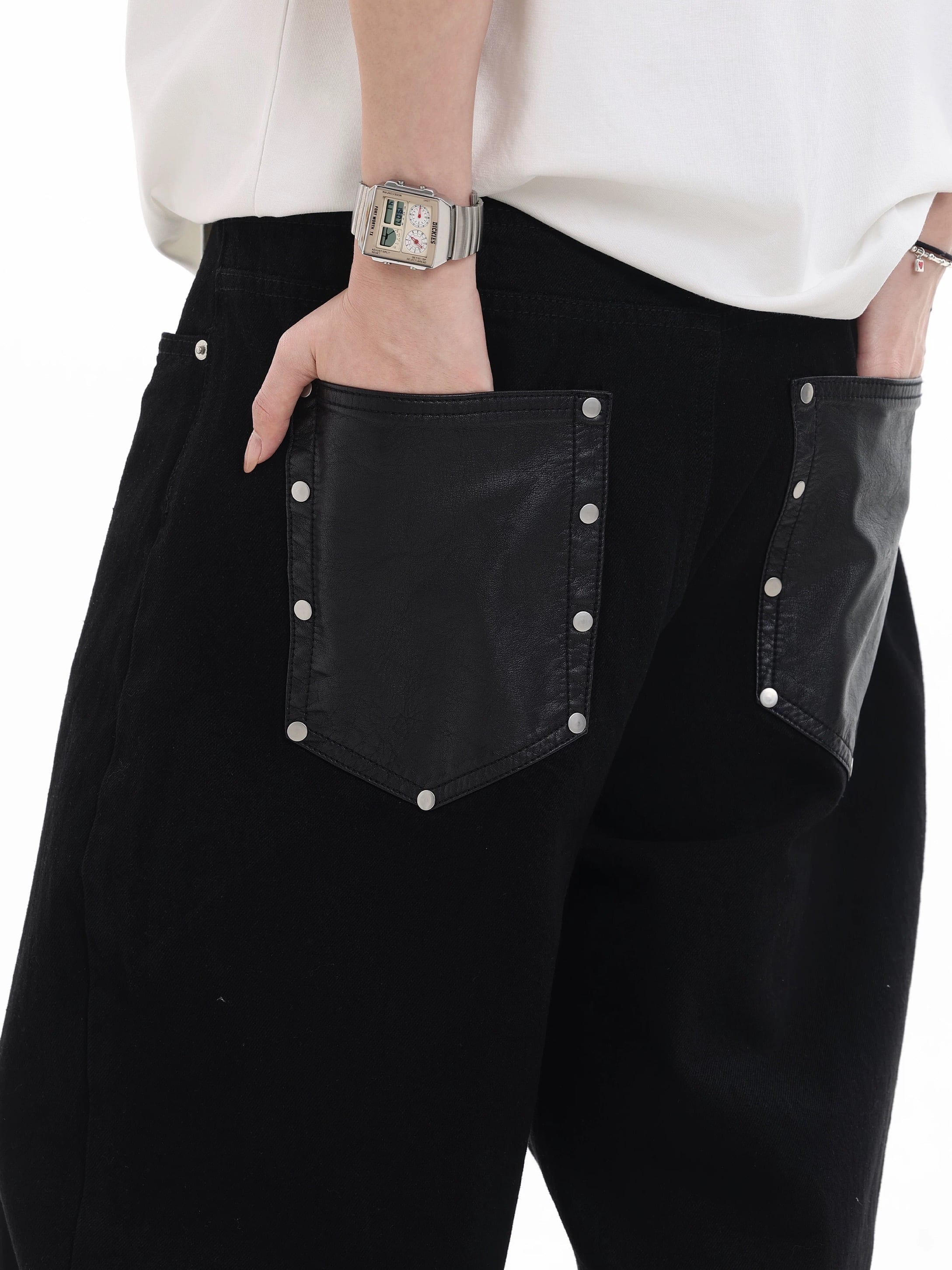 バックポケットのスタッズデザインが特徴のワイドパンツ。