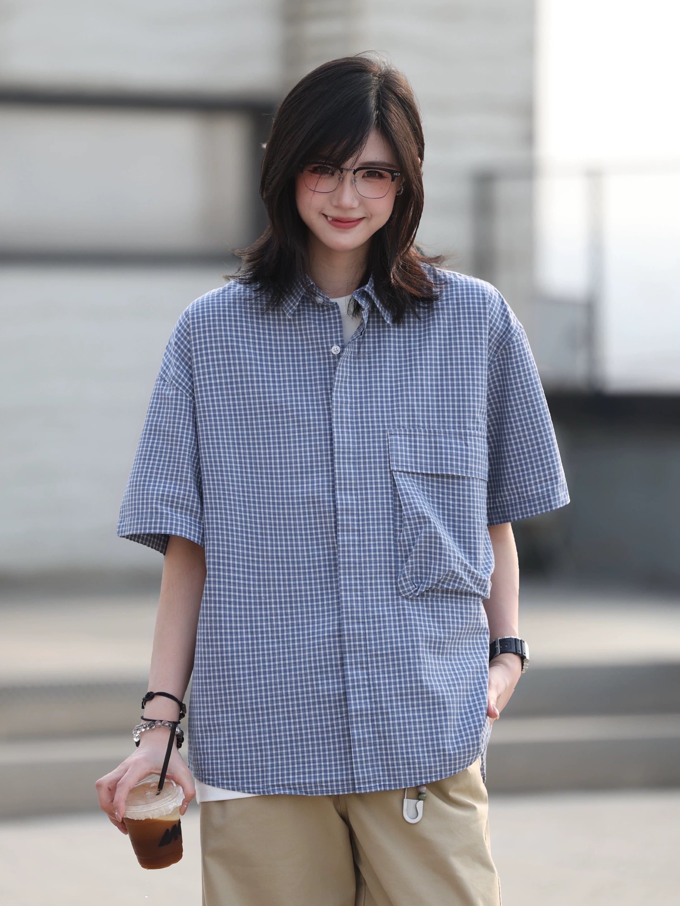 細やかなチェック柄と大きめのフロントポケットが特徴のショートスリーブシャツ。